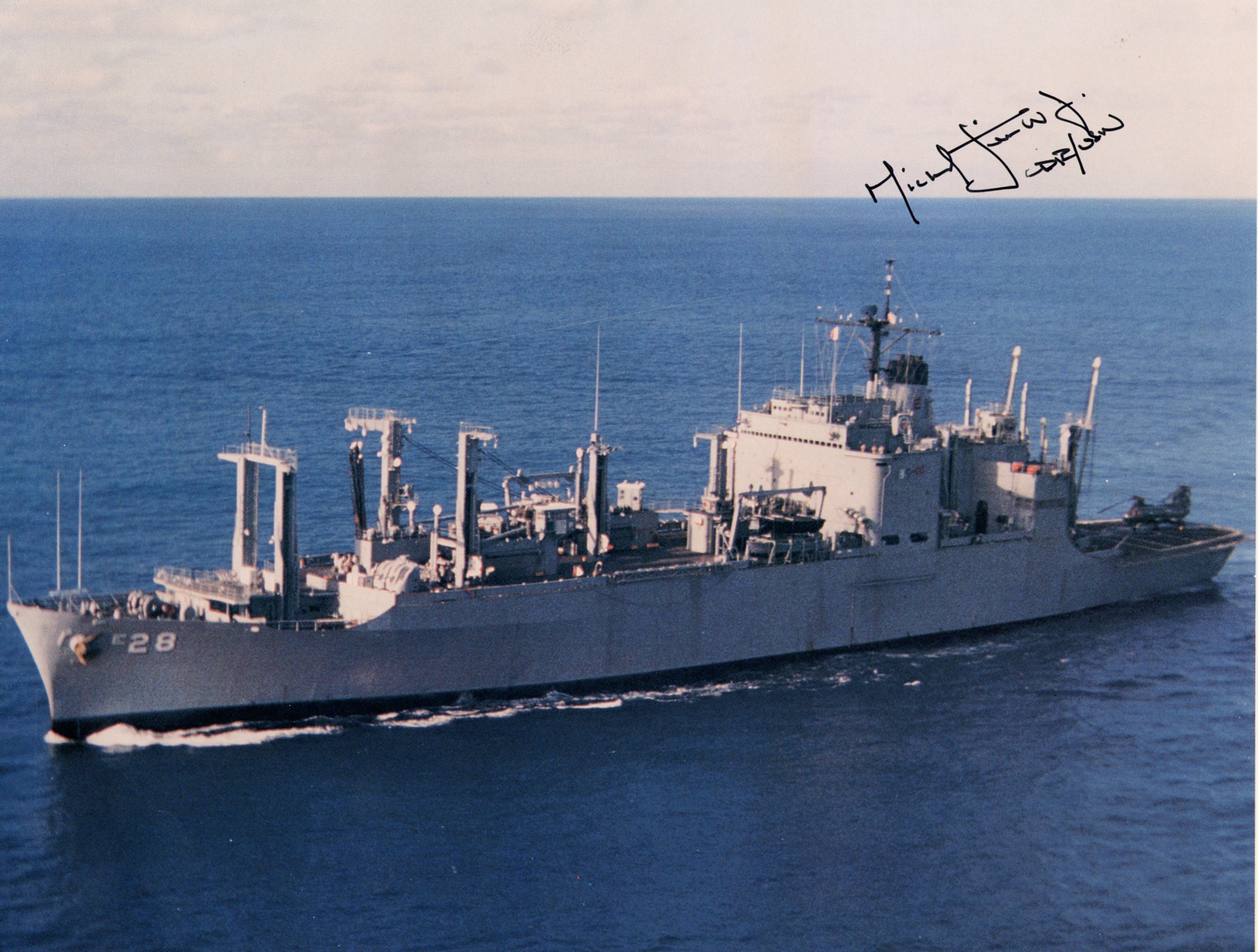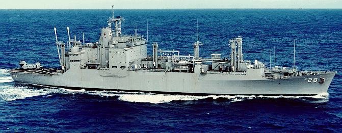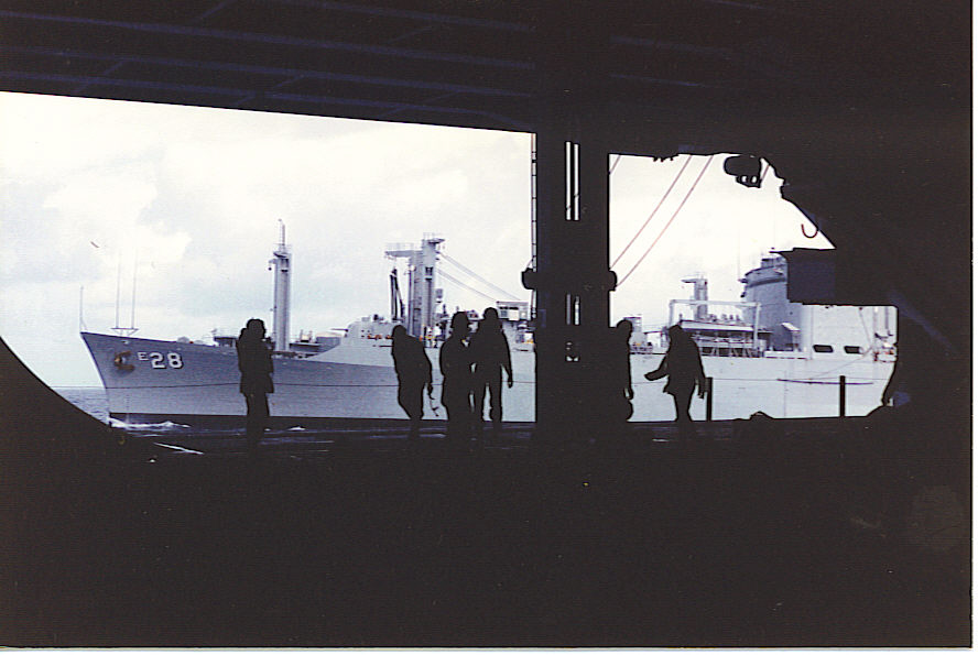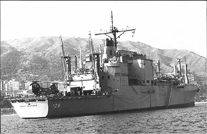 142k | Photo of USS Santa Barbara (AE-28) taken from the hanger deck of USS John F. Kennedy (CVA-67) during an under way replenishment, mid-Atlantic, circa January-February 1989. | Photo by Bob Royes | |