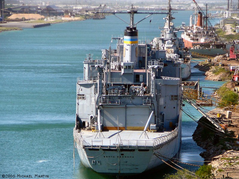 153k | Ex-Santa Barbara (T-AE-28) being scrapped at ESCO, Brownsville, TX., 15 November 2006. Forward of Santa Barbara are ex-Des Moines (CA-134) also being scrapped, and ex-Texas A&M USTS Texas Clipper I [ex-Queens (APA-103)] which is being prepared for sinking as an artificial reef. | Photo by Michael Martin, Brownsville, TX. | |
