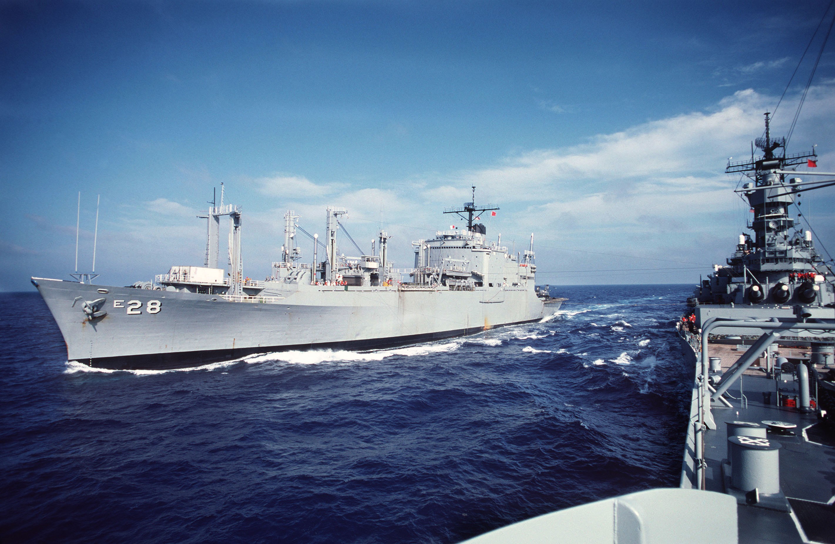 895k | USS Santa Barbara (AE-28) providing ammunition for the battleship USS Iowa (BB-61) during an under way replenishment, on 1 August 1984. Defense Imagery photo # DN-ST-86-02492, a US Navy photo now in the collections of Defense Imagery. |