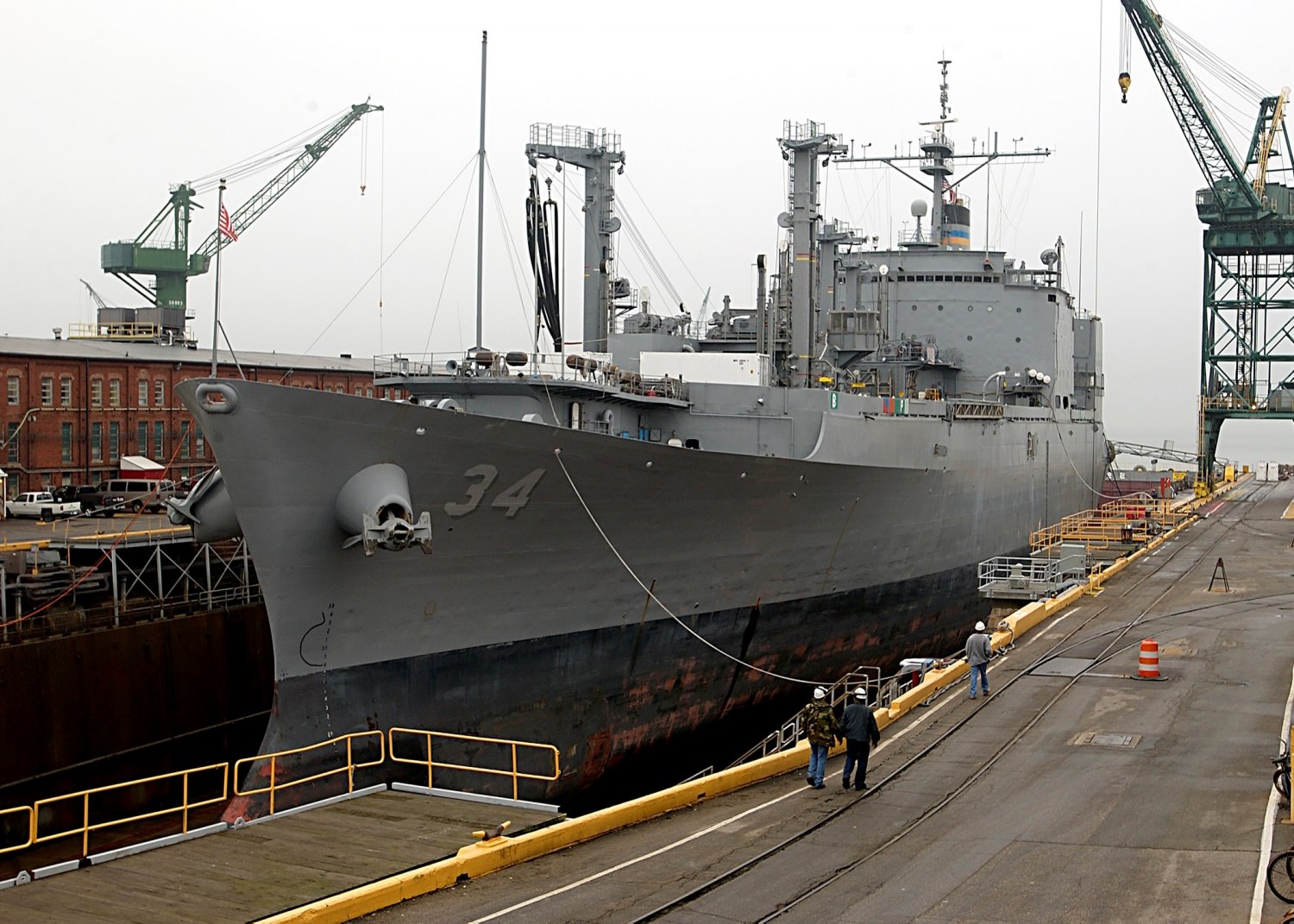 296k | USNS Mount Baker (T-AE-34) drydocked at Northrop Grumman Newport News Shipbuilding, Newport News, VA. for repairs, 22 November 2004. Photo courtesy of Northrop Grumman Newport News | Bill Gonyo | |