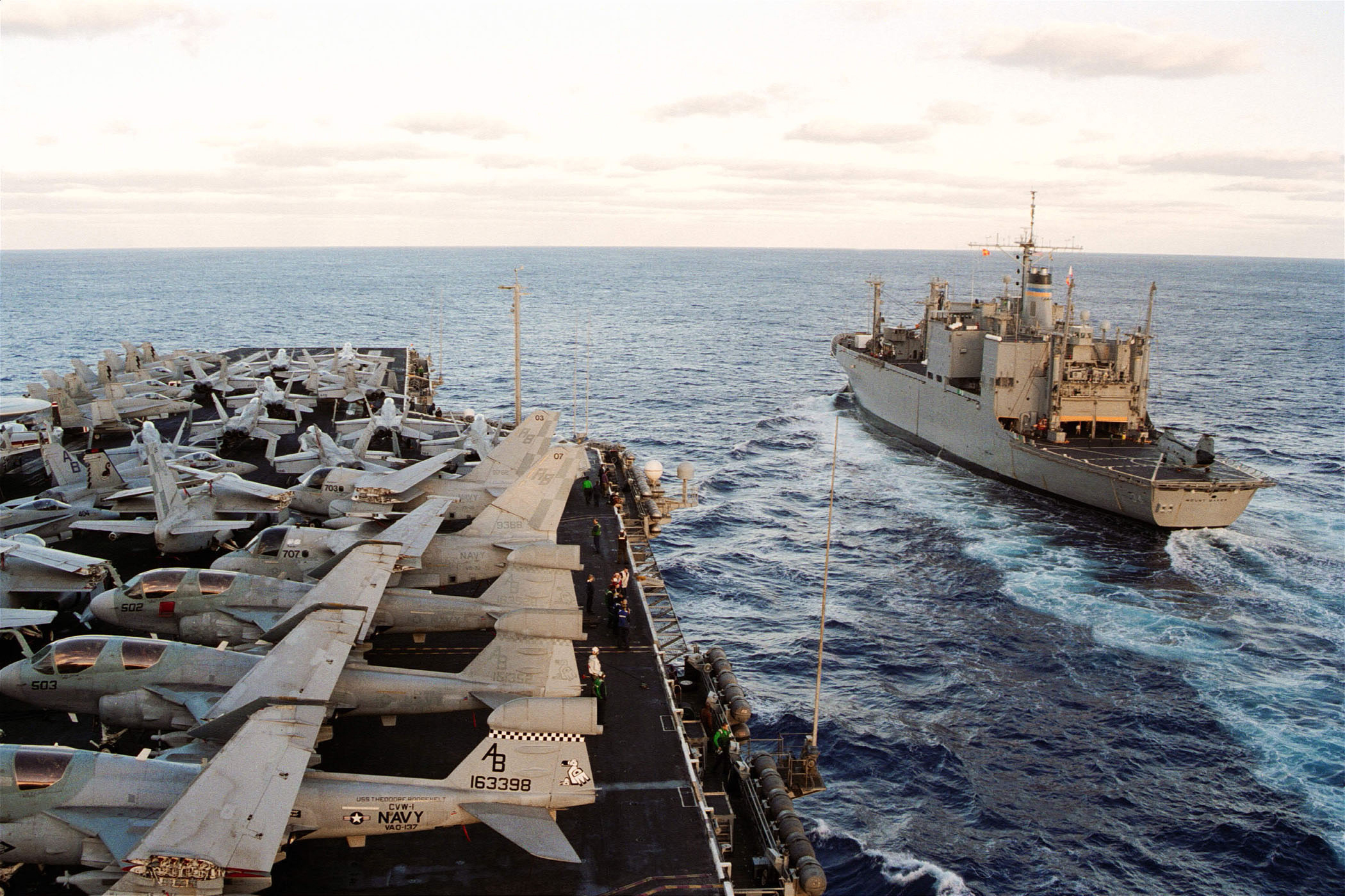 1467k | USNS Mount Baker (T-AE-34) pulls alongside USS Theodore Roosevelt (CVN-71) as the aircraft carrier readies for her return to her homeport, Norfolk, VA. Roosevelt and her carrier air wing are nearing the end of an extended deployment in support of Operation Enduring Freedom.. US Navy photo # 020323-N-6895M-002 At sea aboard USS Theodore Roosevelt (CVN 71) Mar. 23, 2002 by PH3 James K. McNeil. |