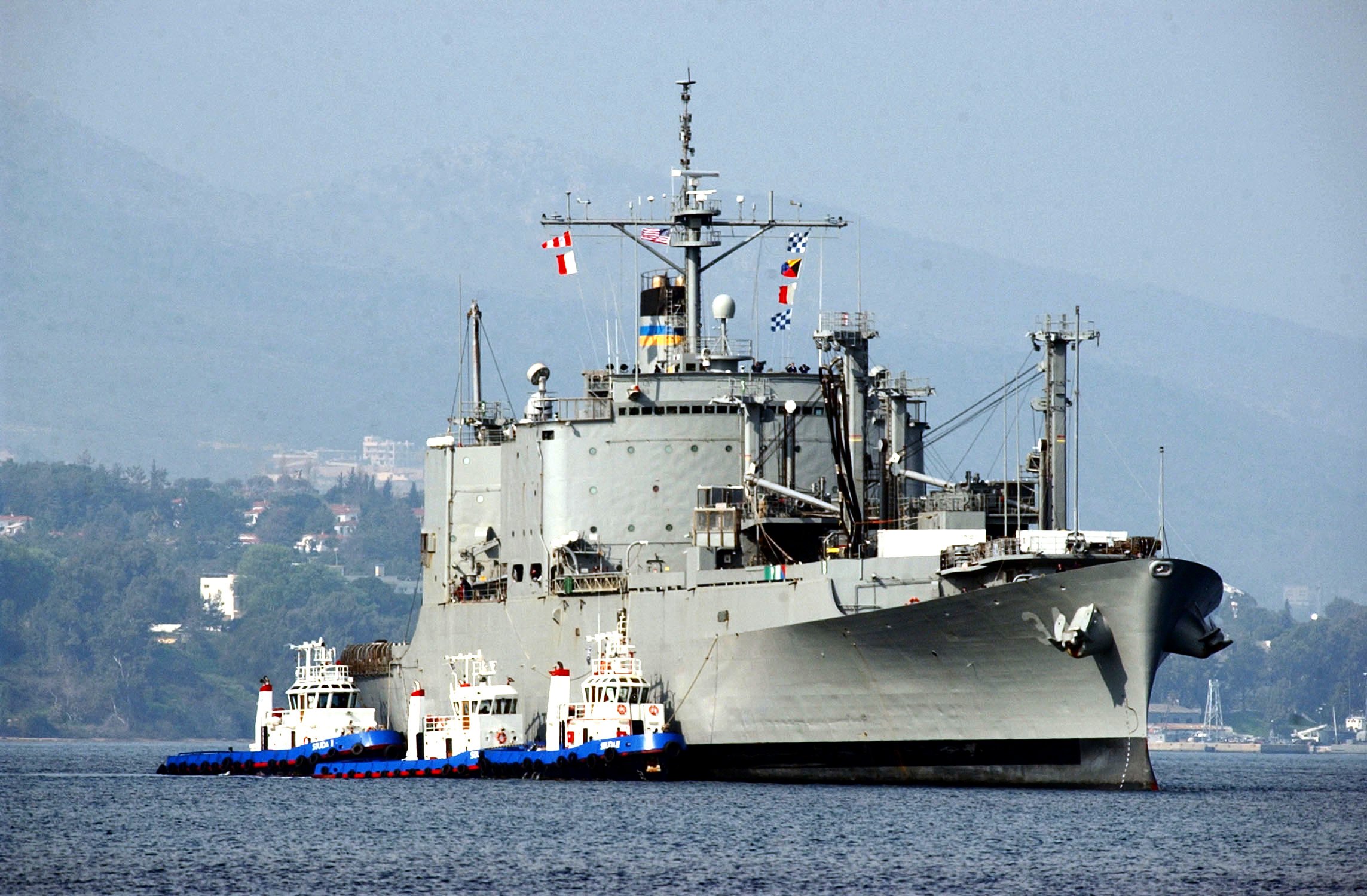 130k | USNS Mount Baker (T-AE-34) is assisted by tugs as she arrives for a routine port visit at Souda Bay, Crete, Greece, 17 March 2004. US Navy photo # 040317-N-0780F-024 by Paul Farley |