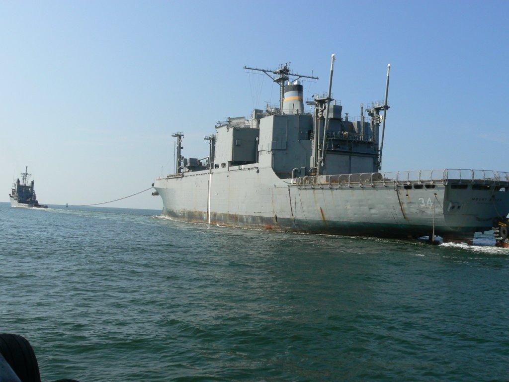 99k | Ex-USNS Mount Baker (T-AE-34) under tow by USNS Apache (T-ATF 172), 29 July 2010, bound for Philadelphia to be stripped of all useable material before being sunk as a target. Detyens Shipyards photo |