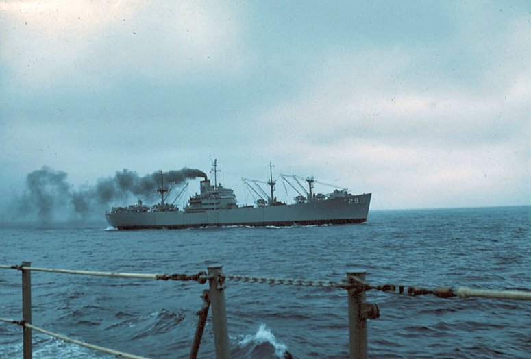 Graffias 1193k The aircraft carrier USS Lexington (CVA-16) and destroyer USS Carpenter (DD-825), left, replenish their supplies from USS Graffias (AF-29) while underway in far eastern waters. Other destroyers are awaiting their turn in the background. A part of the Seventh Fleet, the ships are operating in the Formosa area, 25 September 1958.