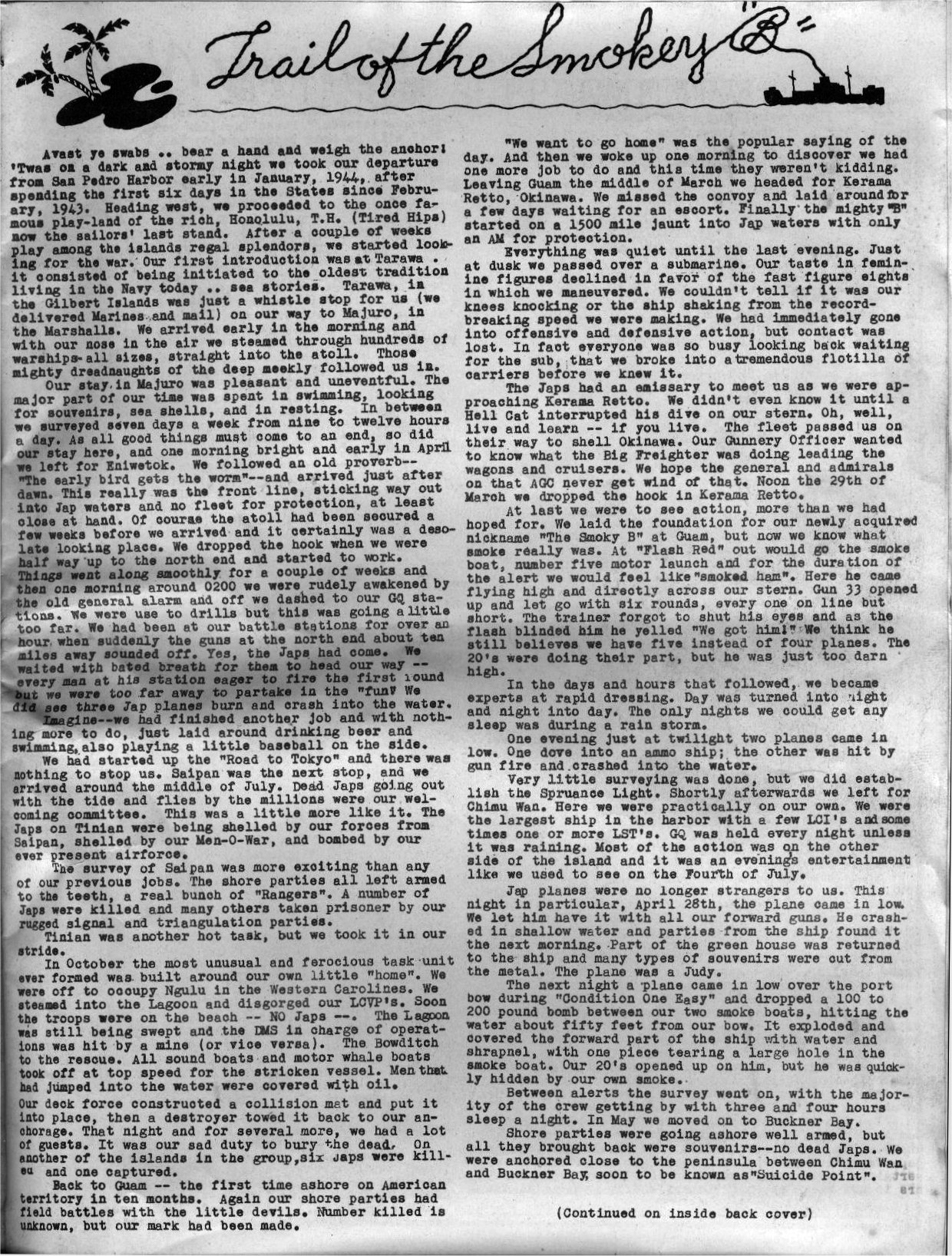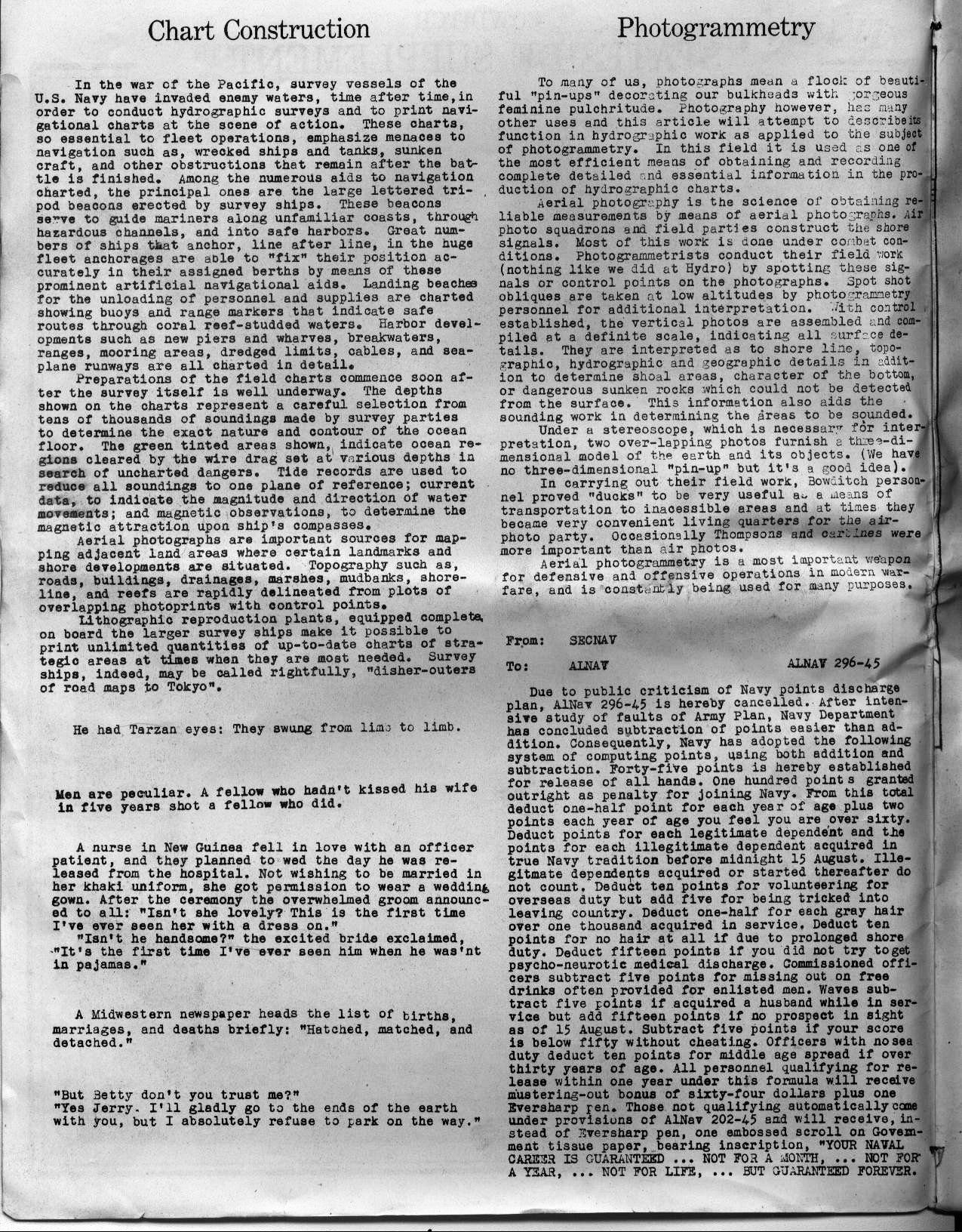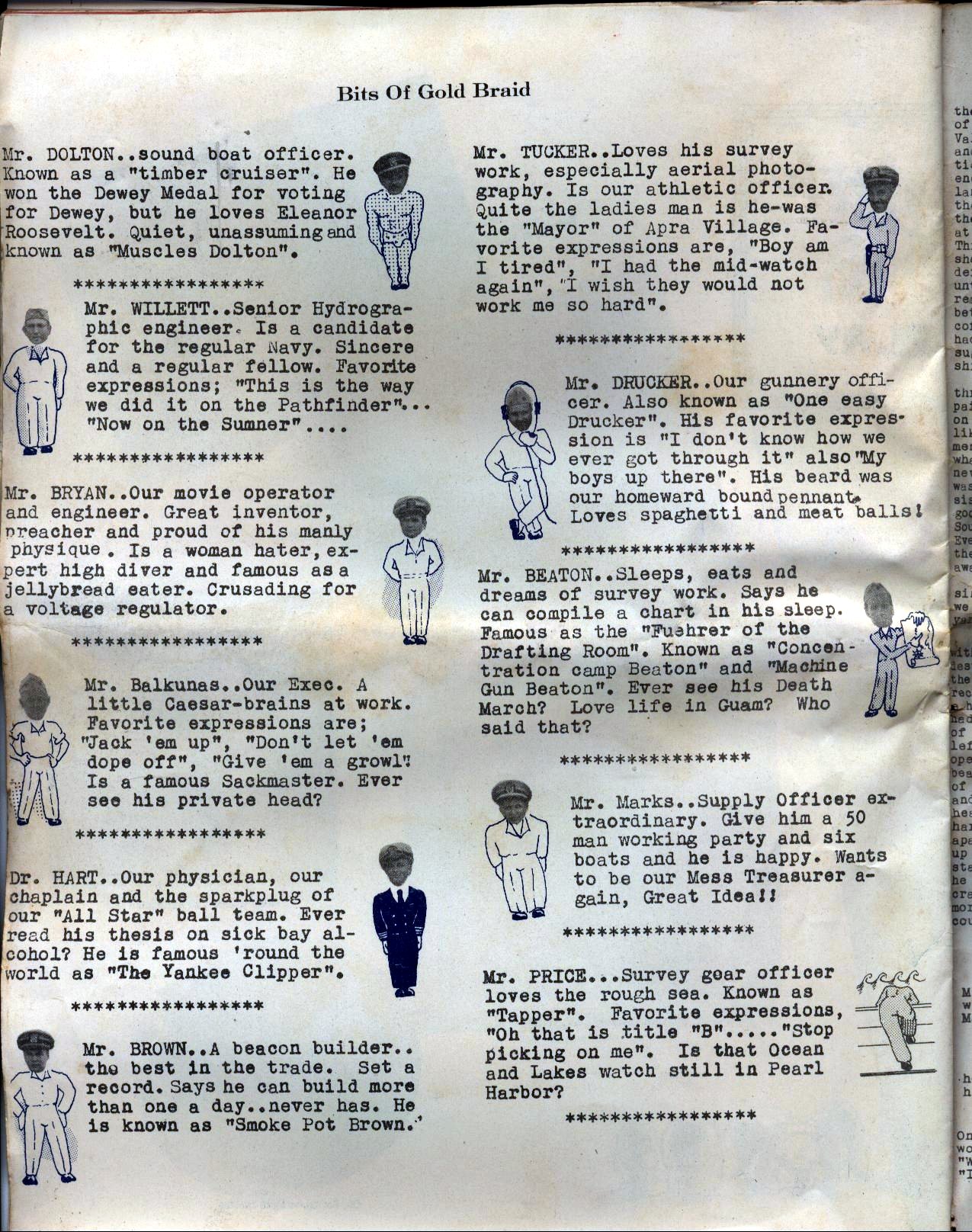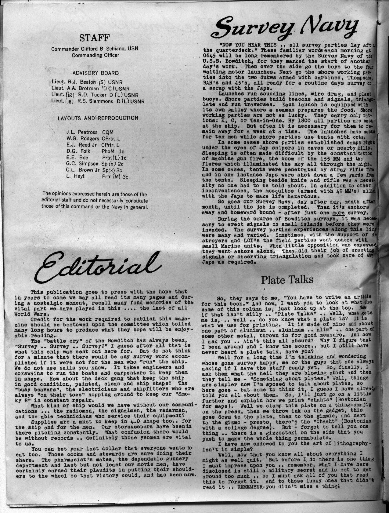![]() Captain, Survey Officer and Crew | ![]() "Trail of the Smokey B" | ![]() "Editorial" | ![]() "Chart Construction/Photogrametry" |