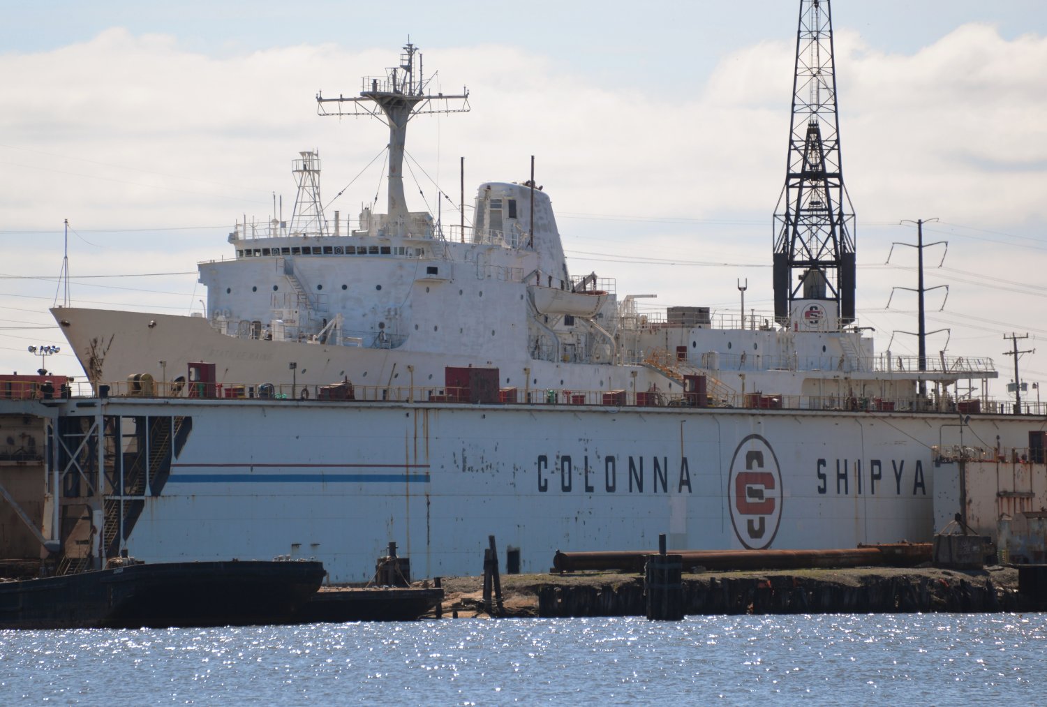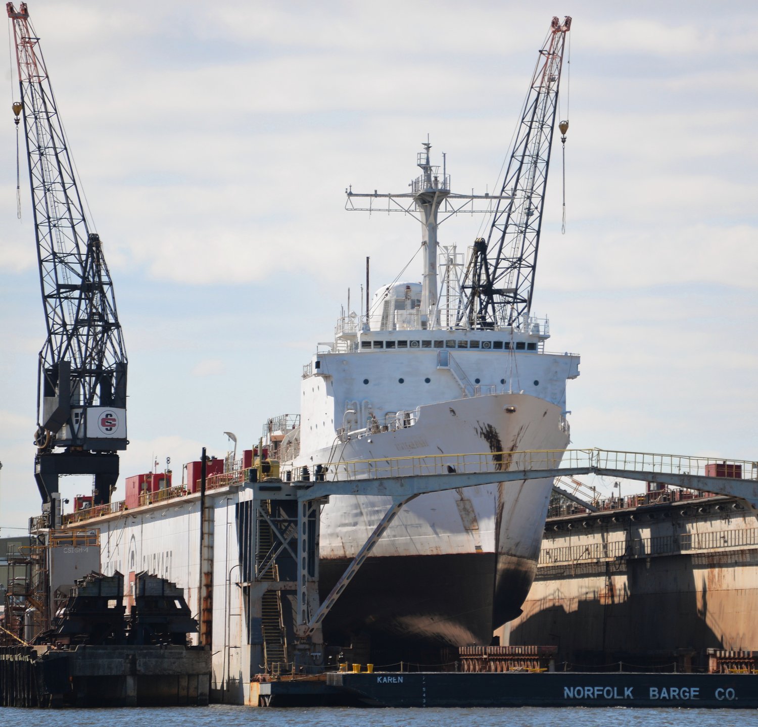 307k | Ex-USNS Harkness (T-AGS-32) drydocked at Colonna's Shipyard, Norfolk, VA., 2 April 2017. Her bottom has been cleaned and recoated. The name "STATE OF MAINE" is still faintly visible on her bows and appears to have been poorly painted over. | Photos by Chris Cavas | |