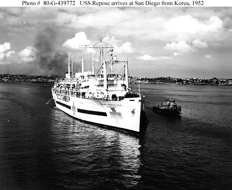 134k | USS Repose (AH-16) approaching San Diego as she returns to the US from her first Korean War deployment, 11 February 1952. US National Archives photo # 80-G-439770, a US Navy photo now in the collections of the US National Archives |