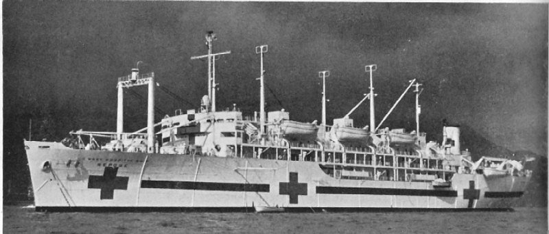 80k | USNS Repose (AH-16) arriving at Yokosuka, Japan, either, 16 September 1950 from the United States, or circa 27 October 1950, from Pusan, South Korea with wounded aboard. Repose was hurriedly placed in service at the out break of the Korean War in September and later commissioned and manned by US Navy in October of 1950. US National Archives photo # 111-SC-282601 from "Hospital Ships of World II: An Illustrated Reference" by Emory A. Massman. |