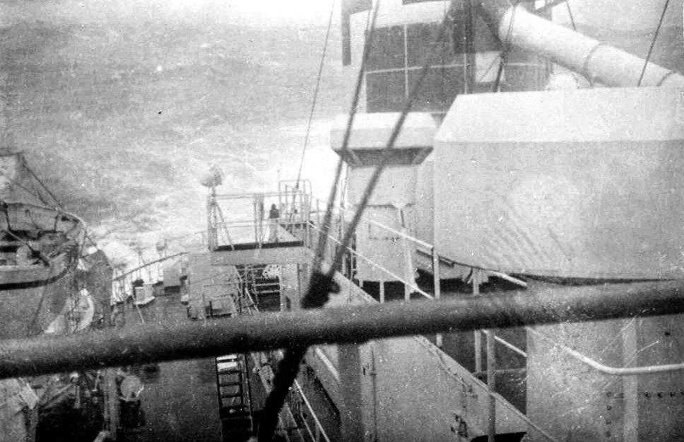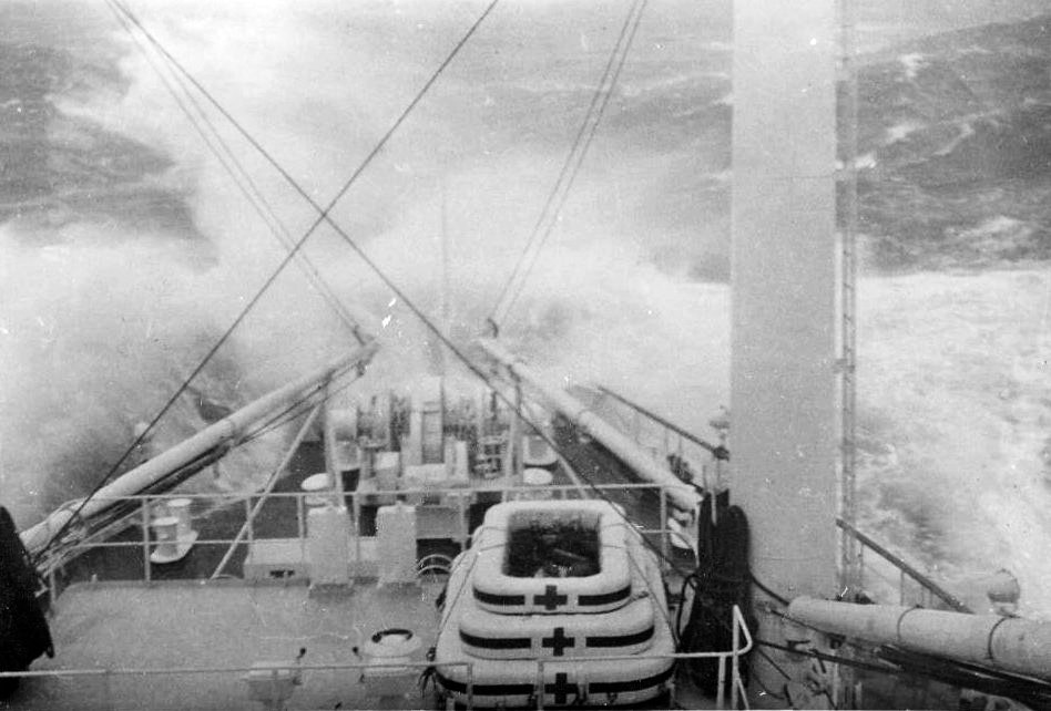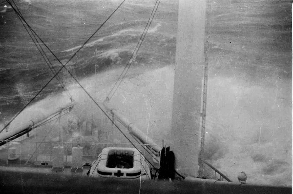 86k | USS Repose (AH-16) underway off Okinawa, during typhoon Ida, 16-17 September 1945. US BUMED photos |