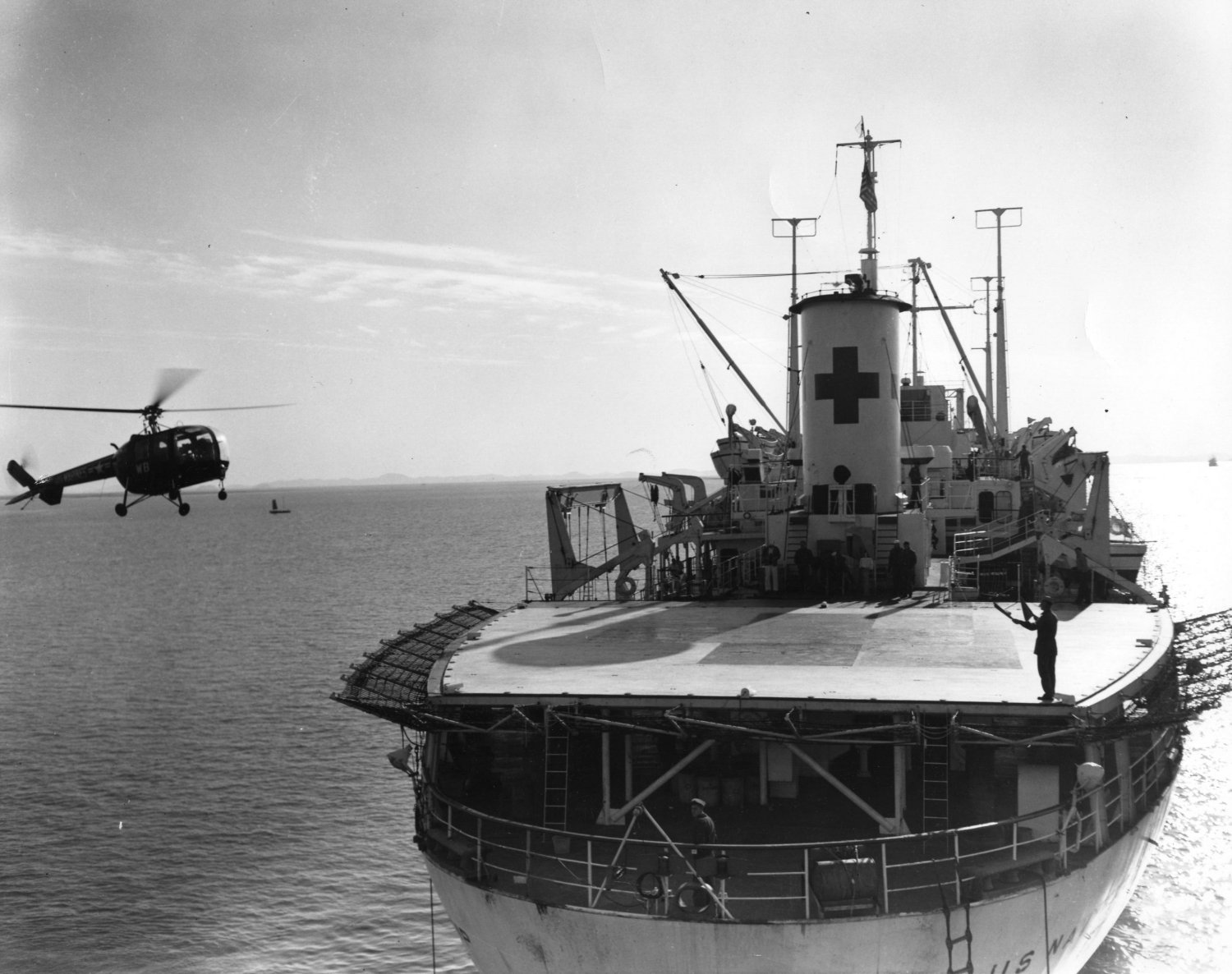 233k | A helicopter approaches the USS Repose (AH-16) landing platform, 23 November 1952 off the coast of Korea. Courtesy of the National Museum of Health and Medicine |