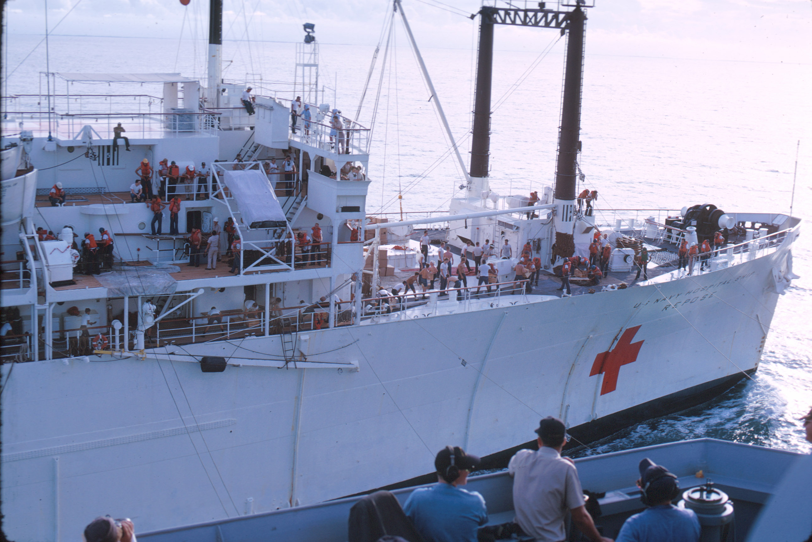 48k | US Navy sailors watch USS Repose (AH-16) off the coast of Vietnam, 29 July 1967. USS Repose received many wounded from the fire aboard the aircraft carrier USS Forrestal (CVA-59) on that day. US Navy photo from the USS Forrestal 1967 Cruise Book. |