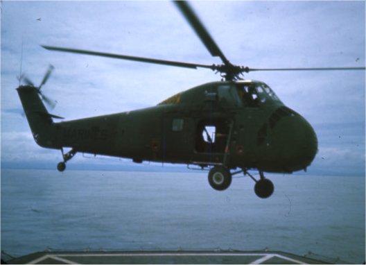 27k | A U.S.Marine Corps Sikorsky UH-34D Seahorse hovering over the stern of USS Repose (AH-16) in 1966.