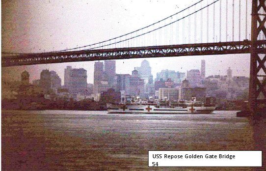 65k | USS Repose (AH-16) leaving San Francisco Bay as she passes under the Golden Gate Bay Bridge, circa 1965-66. US Navy photo |