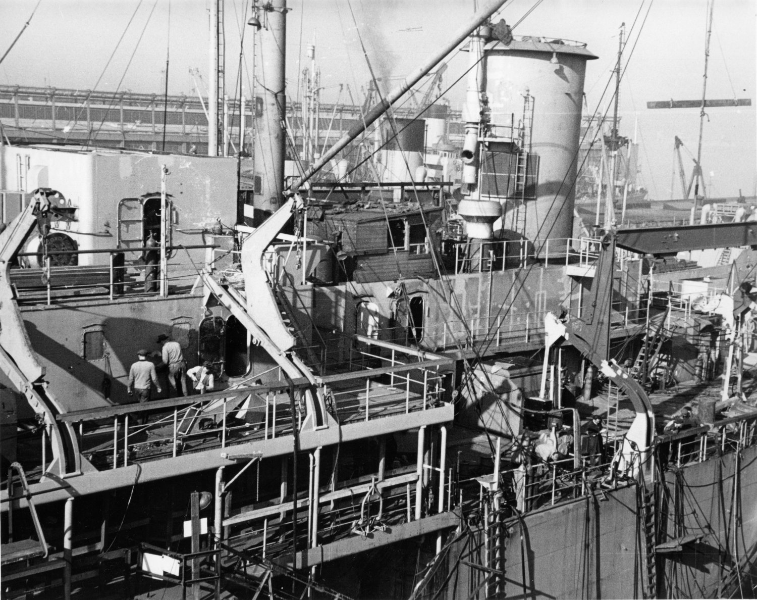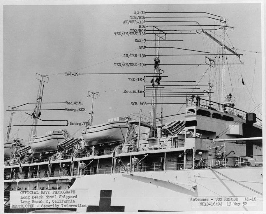133k | USS Repose (AH-16) antenna array, Long Beach Naval Shipyard, 13 May 1952.