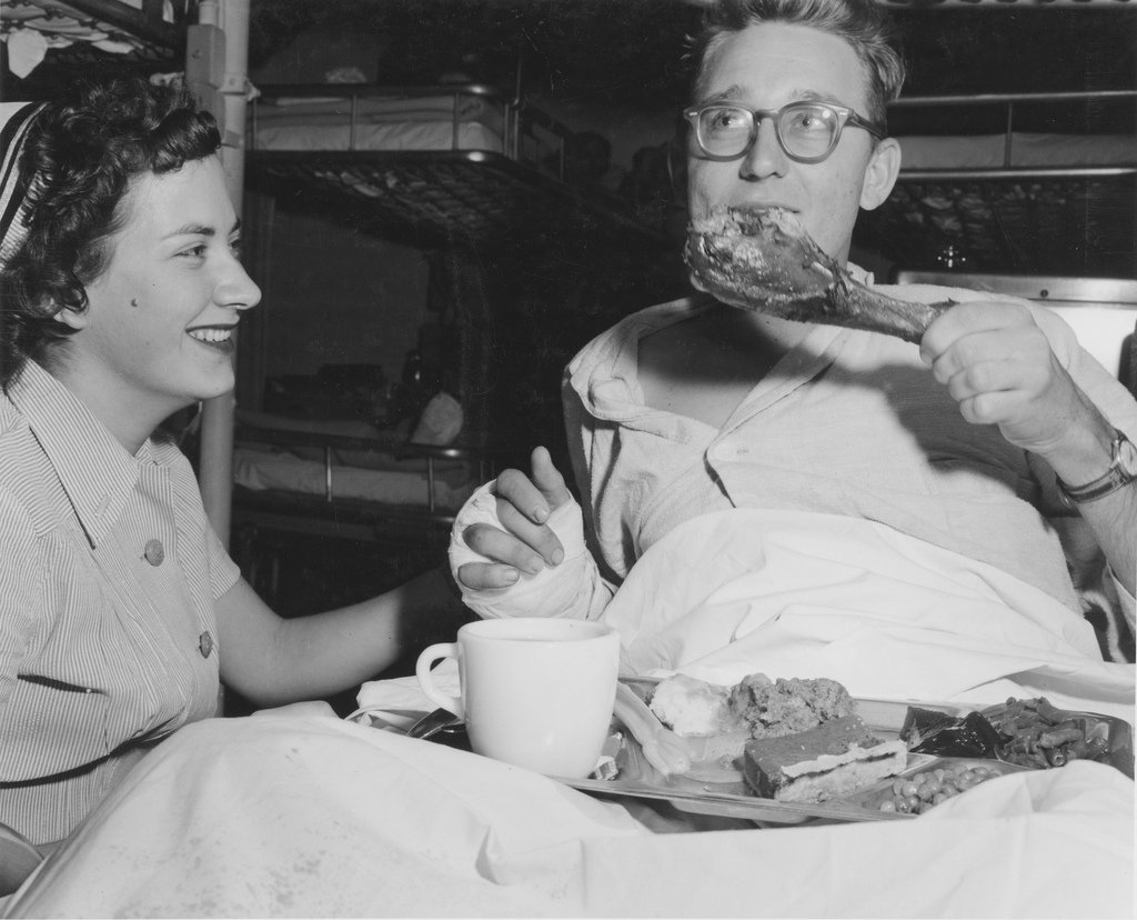 Thanksgiving 1952, Cpl. Richard R. Hollander, USMC, is assisted with his dinner by LTjg. Caldie Green (NC) US Navy