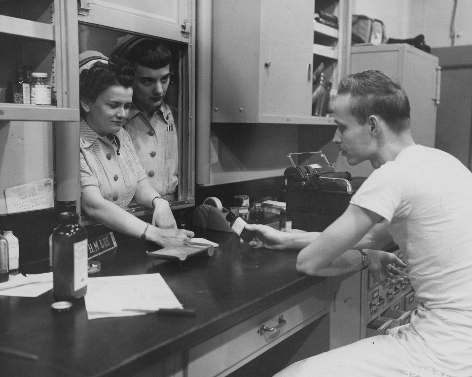 |  HM1 John Petry gives prescription to LTjg. Kathleen Marsh (NC) as LTjg. Rita K. Camp (NC) awaits her turn at the pharmacy office, 28 December 1950 |