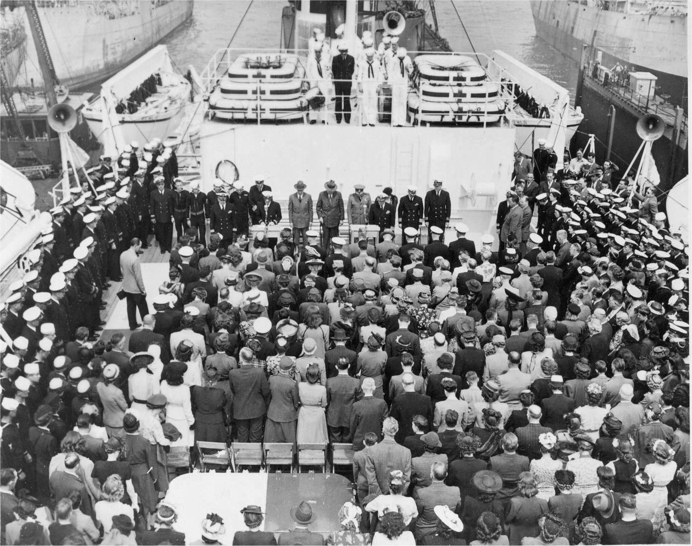 Sailors lining the boat deck, upper deck and main deck to watch ceremony. |