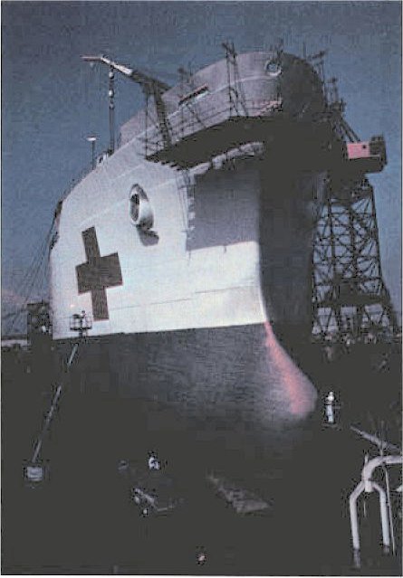 48k | USNS Mercy (T-AH-19)'s bow section in drydock at National Steel and Shipbuilding Co., San Diego, CA. while undergoing conversion from a commercial tanker to a hospital ship, date unknown. National Steel and Shipbuilding photo from "All Hands" magazine, March 1986. |