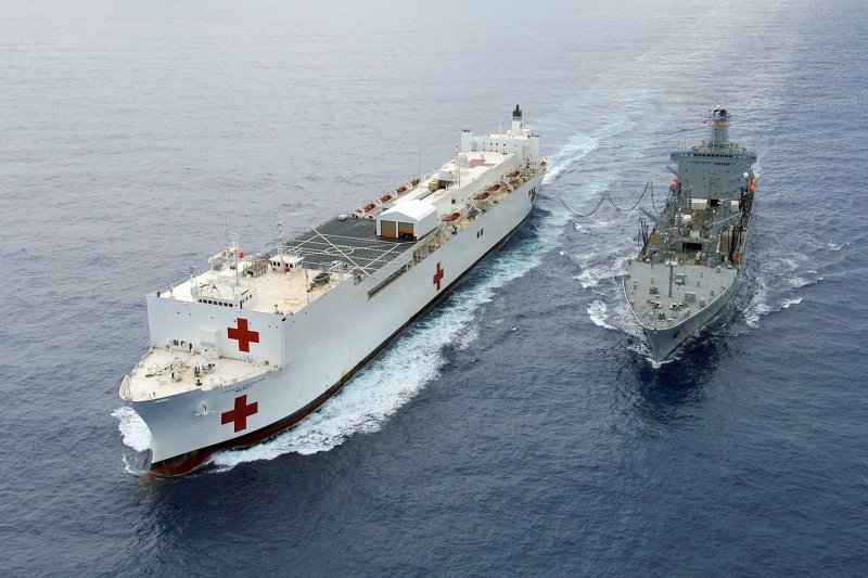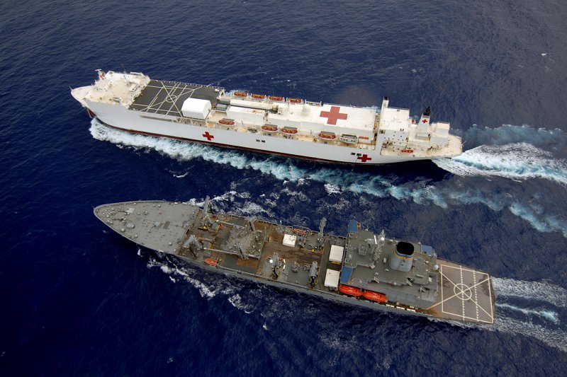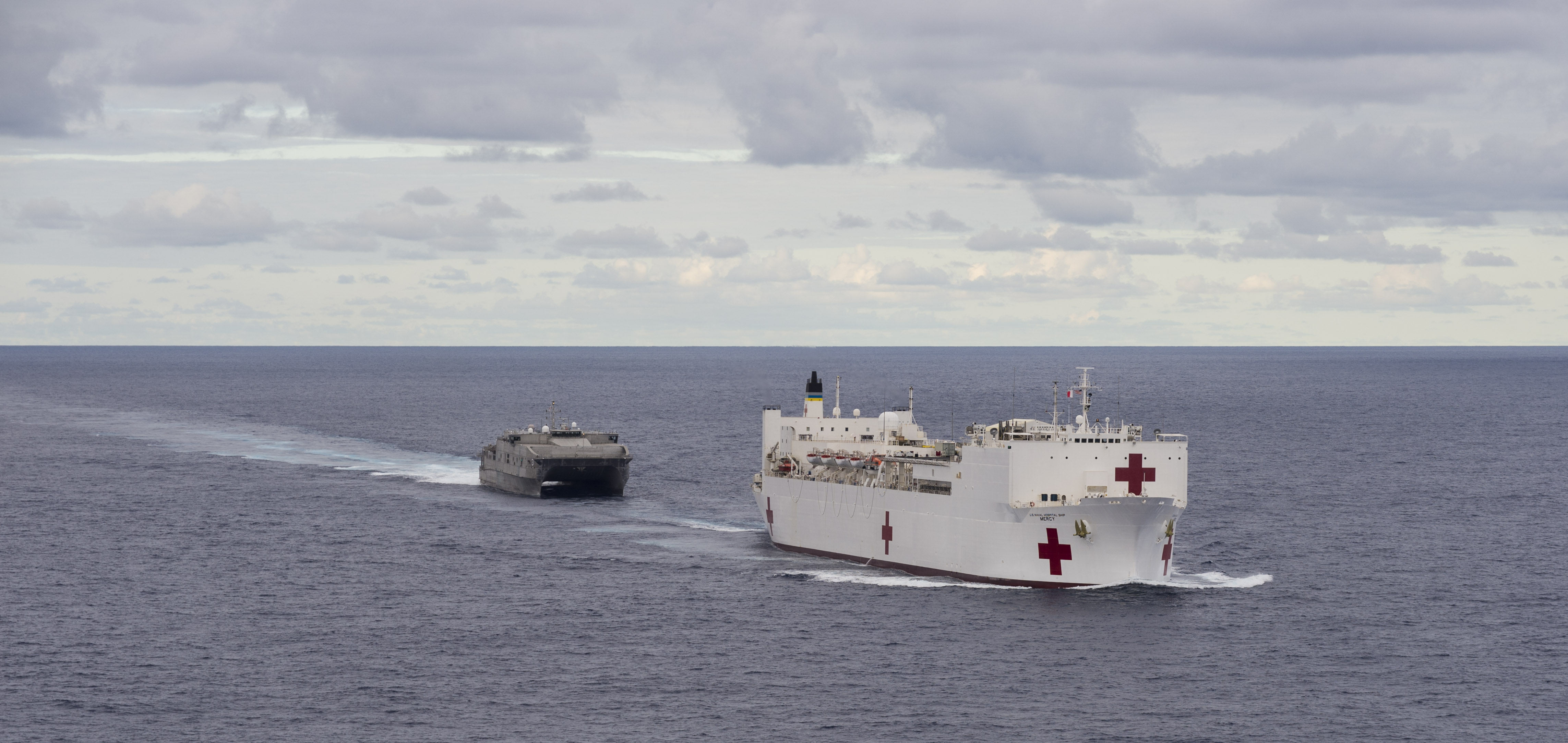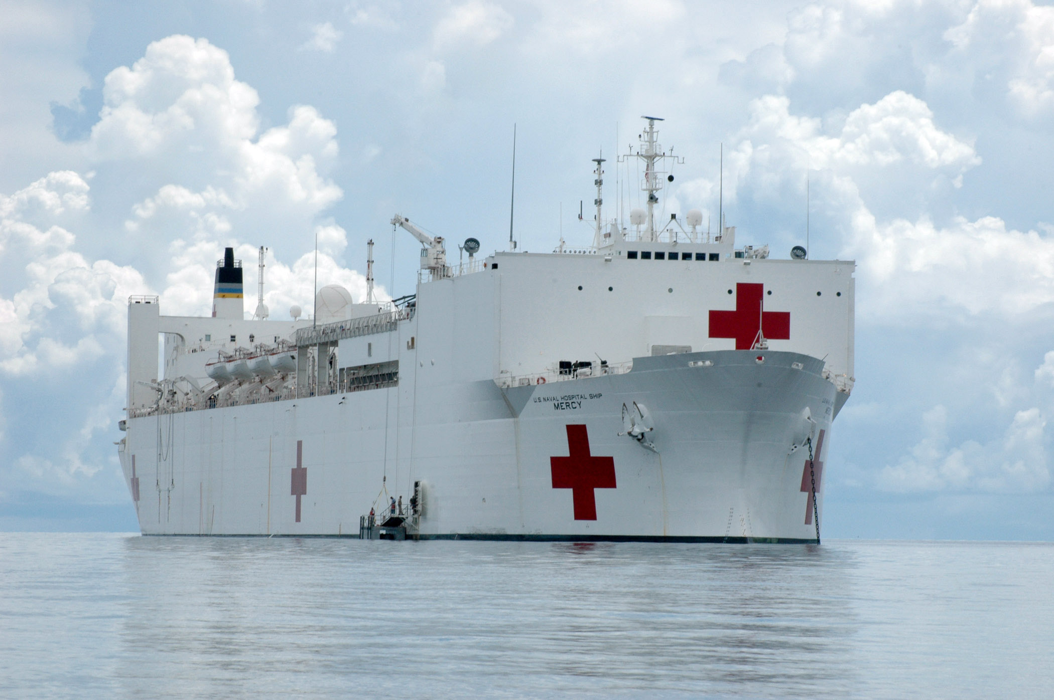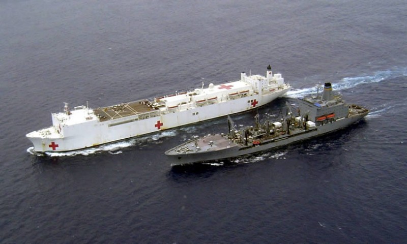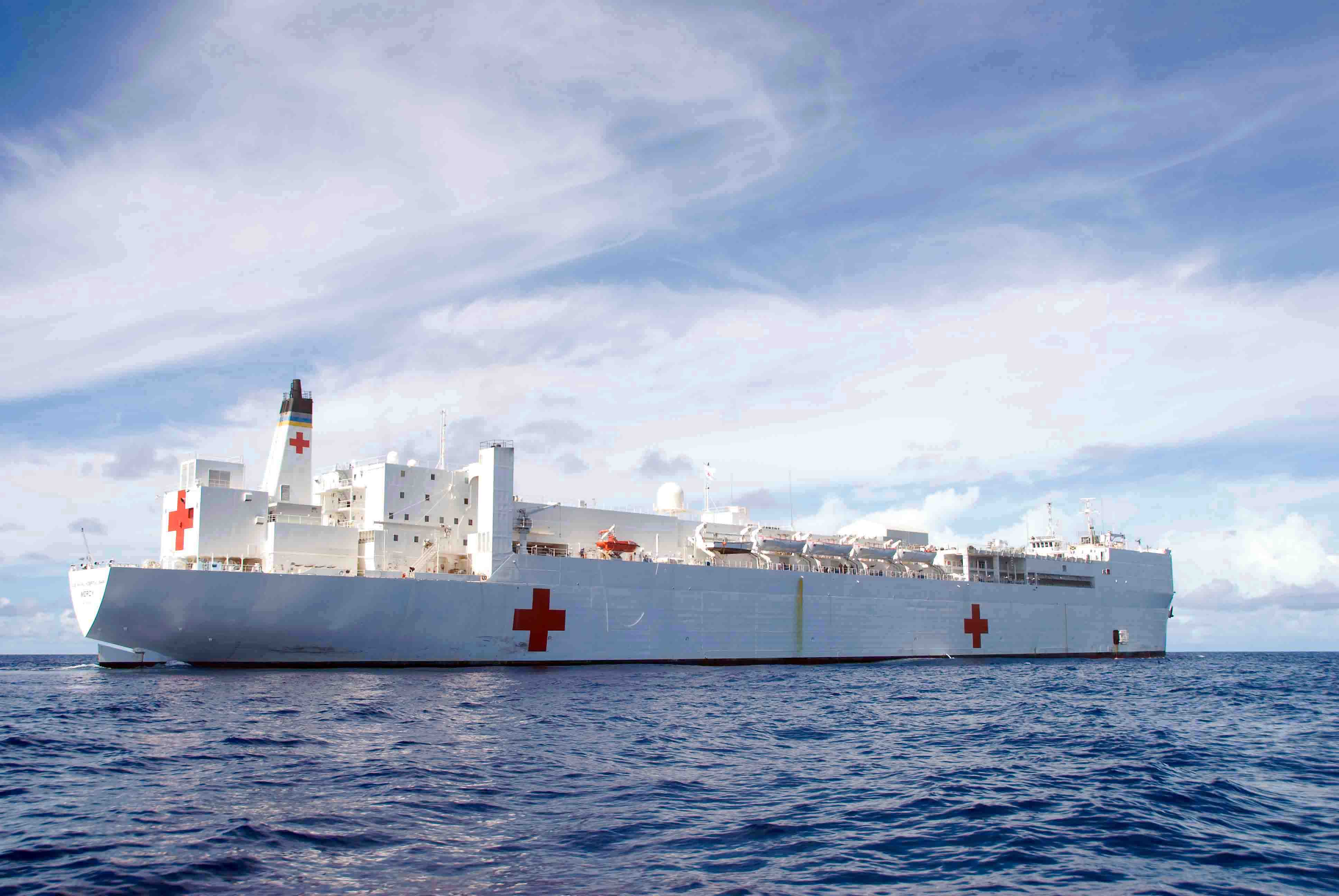 97k | USNS Mercy (T-AH-19) conducting a Replenishment At Sea (RAS) with USNS Pecos (T-AO-197) while underway in the Pacific Ocean, 16 May 2006. Mercy is on a scheduled five-month deployment to deliver aid and humanitarian assistance to the Pacific Islands and Southeast Asia.2006. The medical crew aboard Mercy will provide general and ophthalmology surgery, basic medical evaluation and treatment, preventive medicine treatment, dental screenings and treatment optometry screenings, eye wear distribution, public health training and veterinary services as requested by the host nations. Like all U.S. Naval forces Mercy is able to rapidly respond to a range of situations on short notice. Mercy is uniquely capable of supporting medical- and humanitarian-assistance needs and is configured with special medical equipment and a robust multi-specialized medical team who can provide a range of services ashore as well as aboard the ship. The medical staff is augmented with an assistance crew, many of whom are part of non-governmental organizations that have significant medical capabilities.