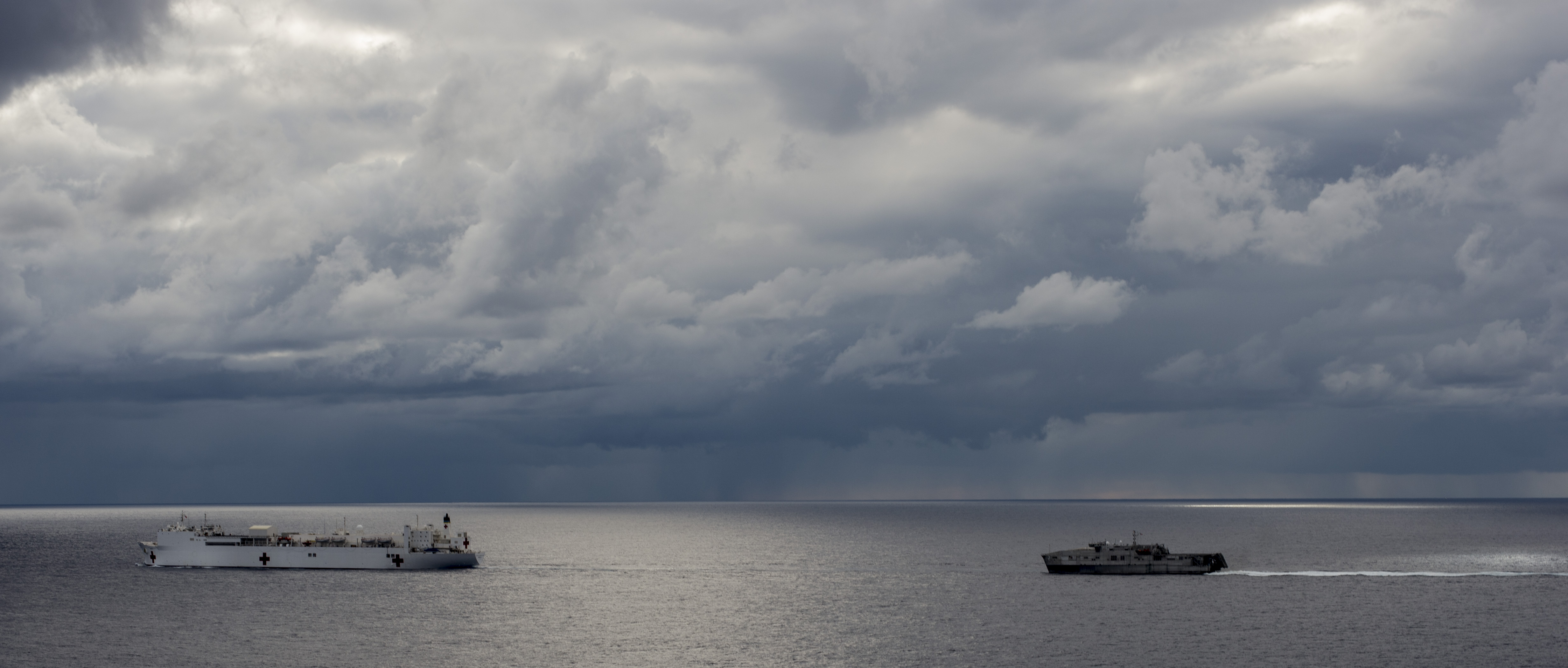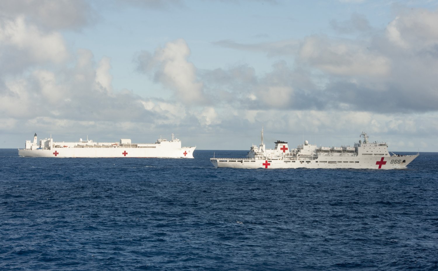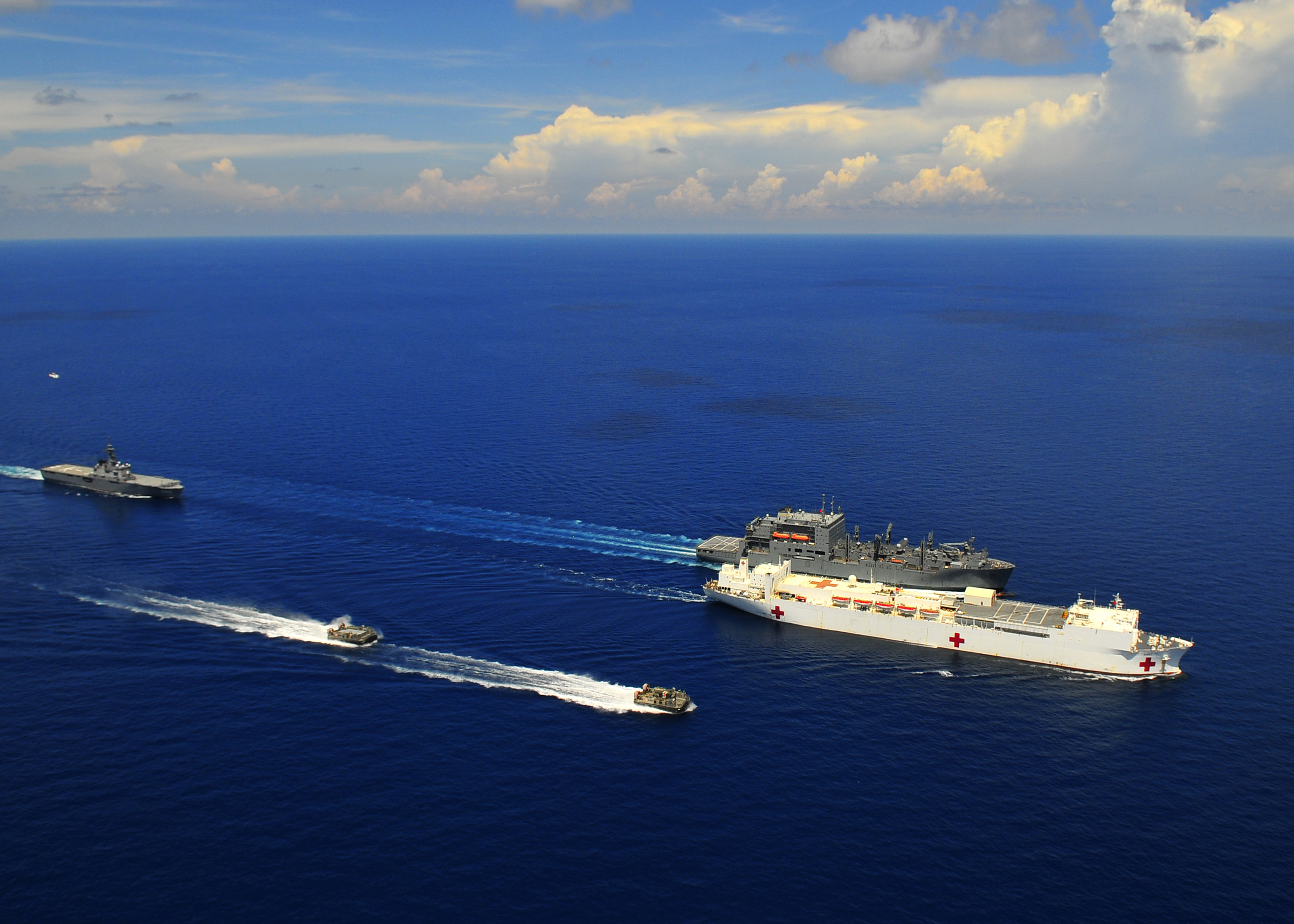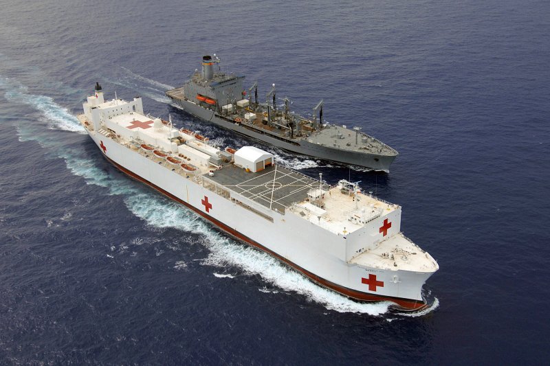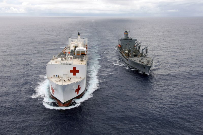 97k | USNS Mercy (T-AH-19) conducting a Replenishment At Sea (RAS) with USNS Pecos (T-AO-197) while underway in the Pacific Ocean, 16 May 2006. Mercy is on a scheduled five-month deployment to deliver aid and humanitarian assistance to the Pacific Islands and Southeast Asia.2006. The medical crew aboard Mercy will provide general and ophthalmology surgery, basic medical evaluation and treatment, preventive medicine treatment, dental screenings and treatment optometry screenings, eye wear distribution, public health training and veterinary services as requested by the host nations. Like all U.S. Naval forces Mercy is able to rapidly respond to a range of situations on short notice. Mercy is uniquely capable of supporting medical- and humanitarian-assistance needs and is configured with special medical equipment and a robust multi-specialized medical team who can provide a range of services ashore as well as aboard the ship. The medical staff is augmented with an assistance crew, many of whom are part of non-governmental organizations that have significant medical capabilities.