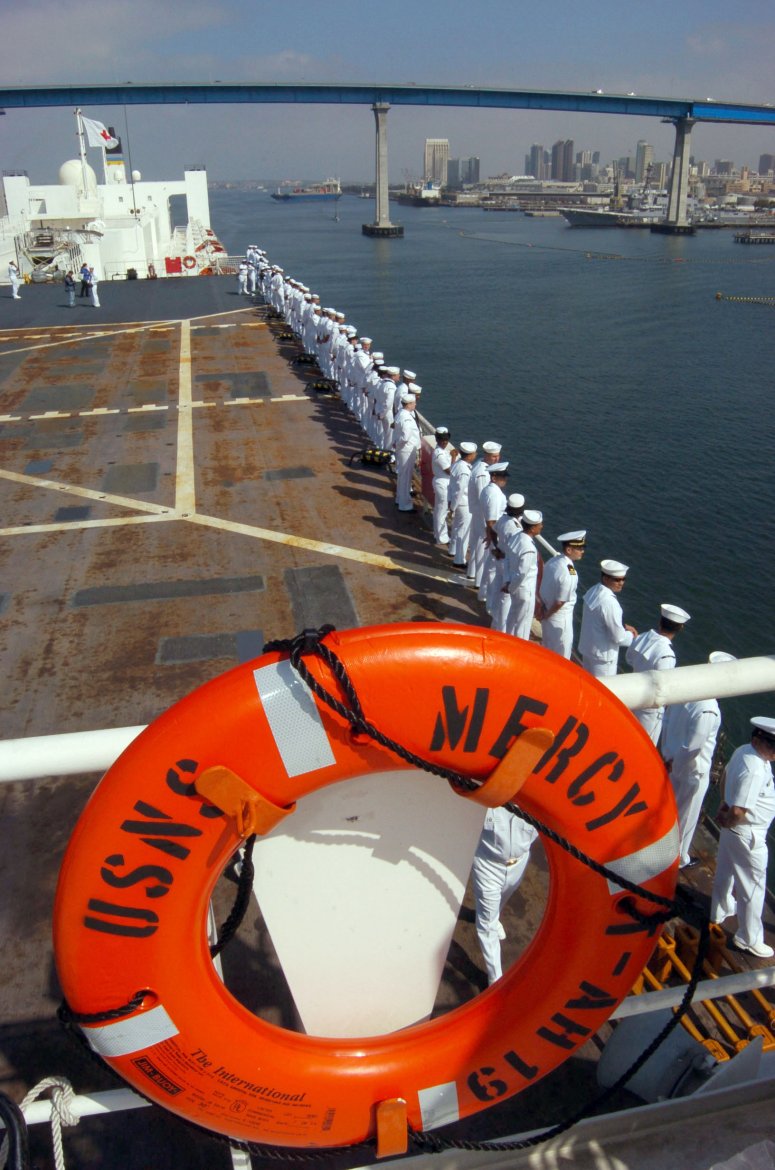 165k | USNS Mercy (T-AH-19) sailors man-the-rails as the ship prepares to pull pier side at Naval Station San Diego, 8 June 2005. Mercy was returning from a five-month deployment in support of tsunami relief efforts and humanitarian aide missions to several South Pacific nations. US Navy photo # 050608-N-1485H-002 by PH3 Lamel J. Hinton |