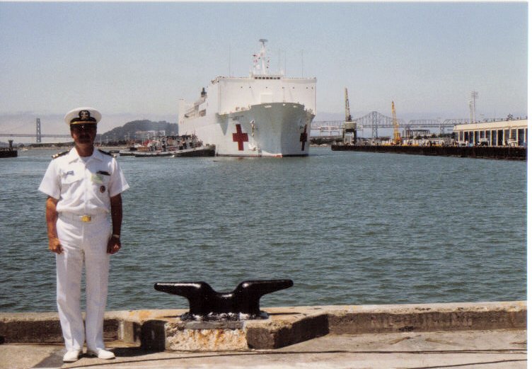 81k | USNS Mercy (T-AH-19) arriving at US Naval Supply Center, Oakland, CA., her new homeport, 13 July 1987. LT Robert M. Cieri USNR in is the foreground. | Robert M. Cieri | |