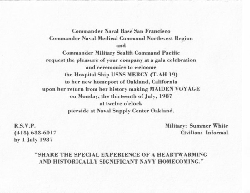 63k | Invitation to the Welcome Home ceremony for USNS Mercy (T-AH-19), 13 July 1987, Naval Supply Center Oakland. | Robert M. Cieri | |