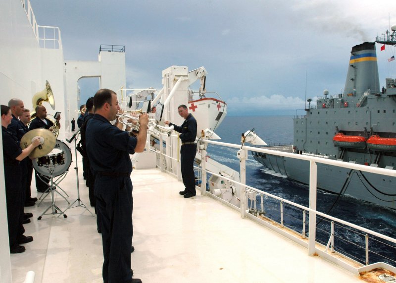 87k | MUC Donald Chilton, USN, conducts the US Navy Show Band as they perform on board USNS Mercy (T-AH-19) as the ship conducts a Replenishment At Sea (RAS) operations with USNS Pecos (T-AO-197). The Mercy was conducting a scheduled five-month deployment to deliver aid and humanitarian assistance to the Pacific Islands and Southeast Asia.2006. The Show band home based in Norfolk, VA. is deployed with the Mercy for the five-month humanitarian mission to South Asia Southeast Asia and the Pacific Islands