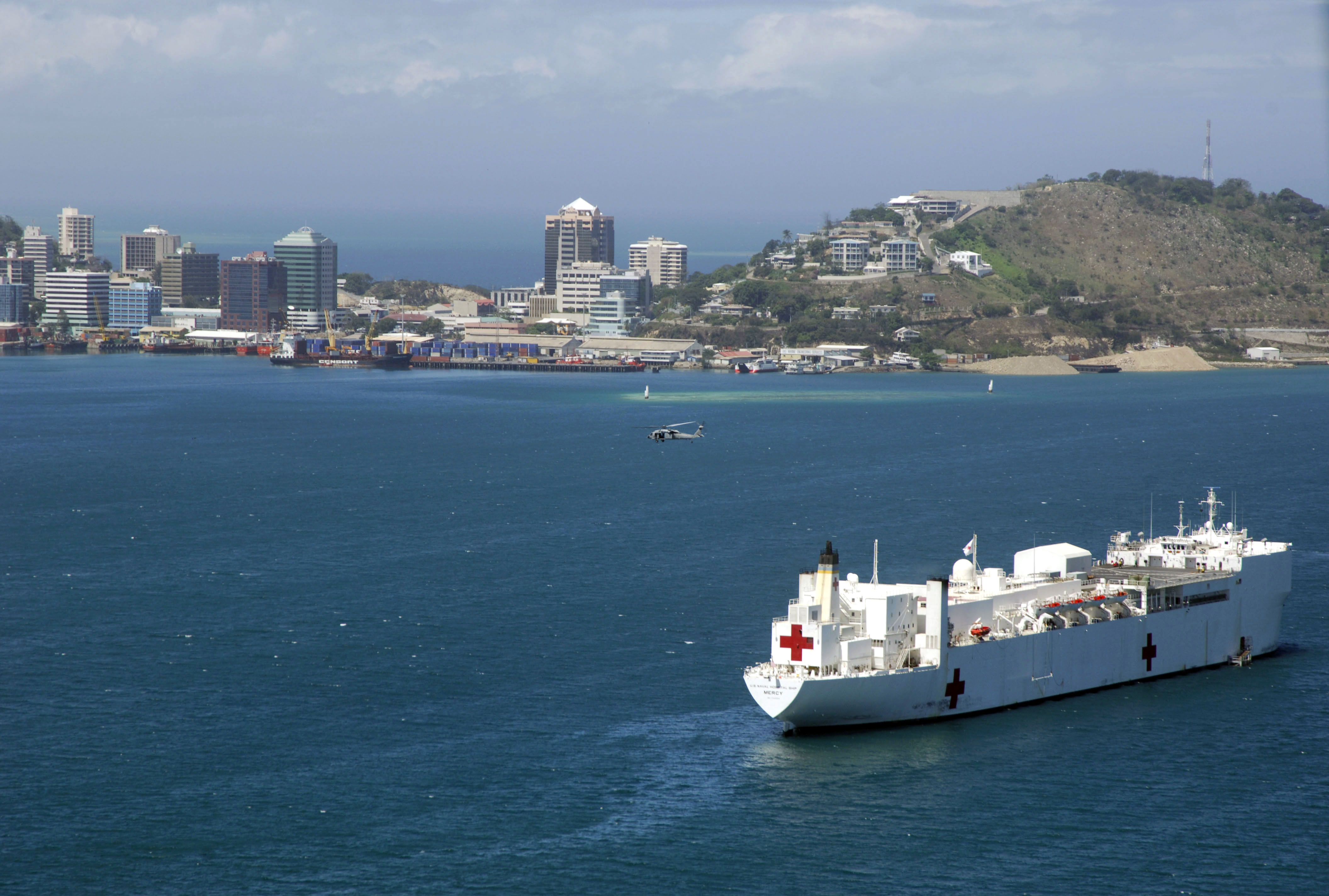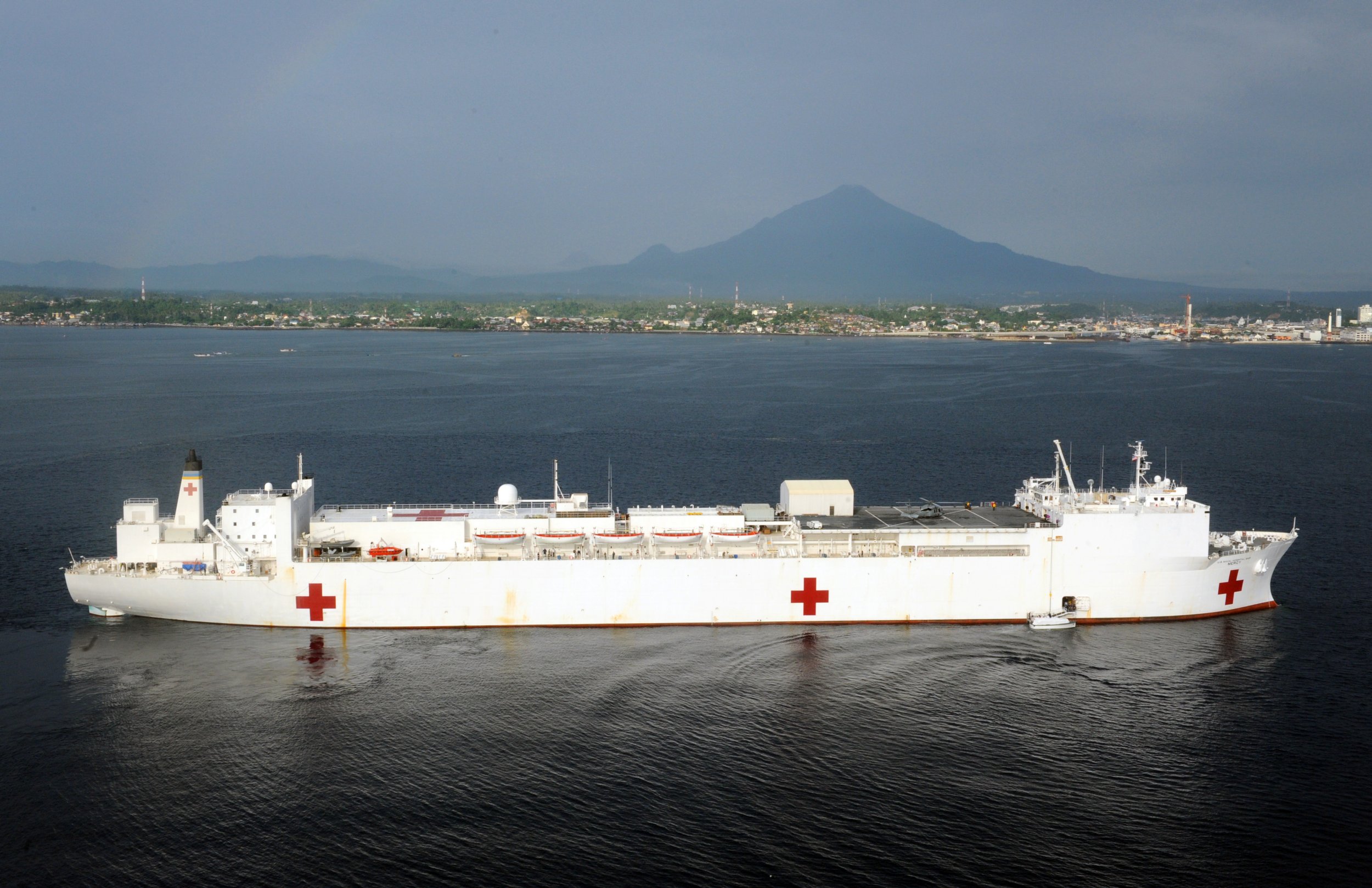 166k | USNS Mercy (T-AH 19) sits at anchorage in Simpson Harbor off the coast of Rabaul, Papua New Guinea. Mercy is