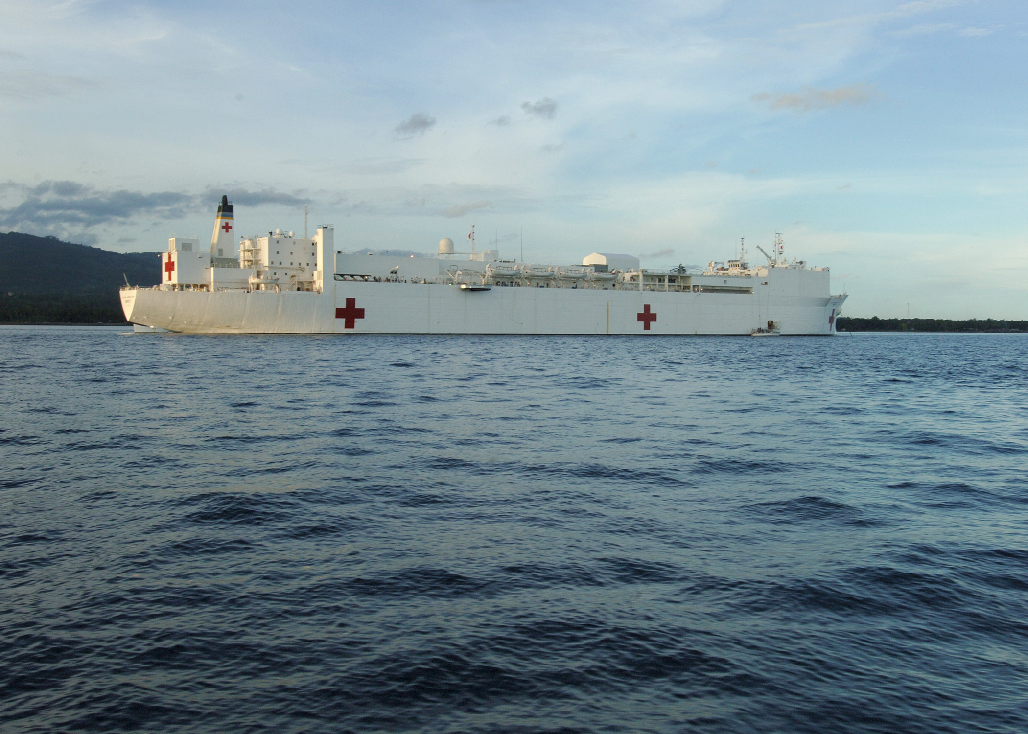 464k | USNS Mercy (T-AH-19) at anchor off the coast of Zamboanga, Republic of the Philippines, 2 June 2006. Mercy is conducting a humanitarian and civic assistance mission in the area during its five-month deployment to South Asia, Southeast Asia and the Pacific Islands. US Navy photo # 060602-N-1577S-129 Zamboanga, Philippines June 2, 2006 by PH3 Timothy F. Sosa. |