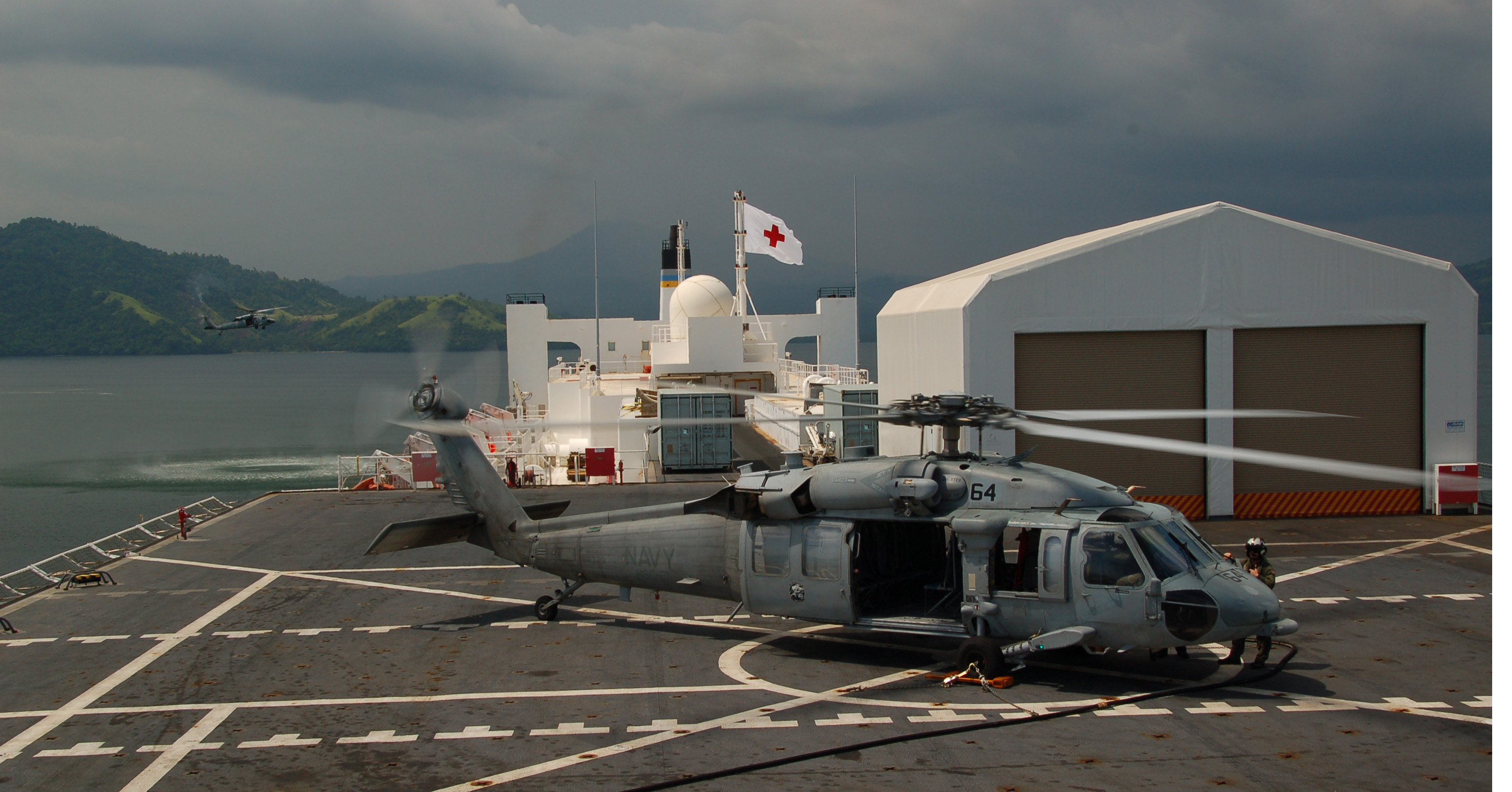 76k | USNS Mercy (T-AH-19) navigates alongside USS Abraham Lincoln (CVN 72) after arriving on station near Banda Aceh, Sumatra, Indonesia, 3 February 2005. Mercy has been forward deployed to assist in humanitarian aid efforts currently in progress. Mercy will serve as an enabling platform to assist humanitarian operations ashore in ways that host nations and international relief organization find useful. The Abraham Lincoln Carrier Strike Group has been operating in the Indian Ocean off the waters of Indonesia in support of Operation Unified Assistance the humanitarian relief effort to aid the victims of the tsunami that struck Southeast Asia. US Navy photo # 050203-N-6020P-137 by PH3 Gabriel R. Piper. | Navy NewsStand | |