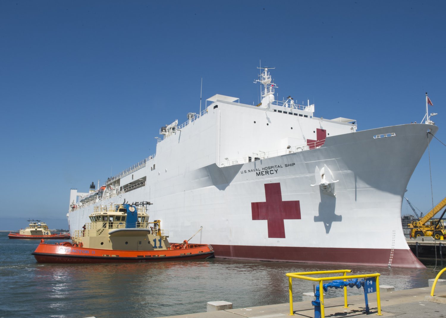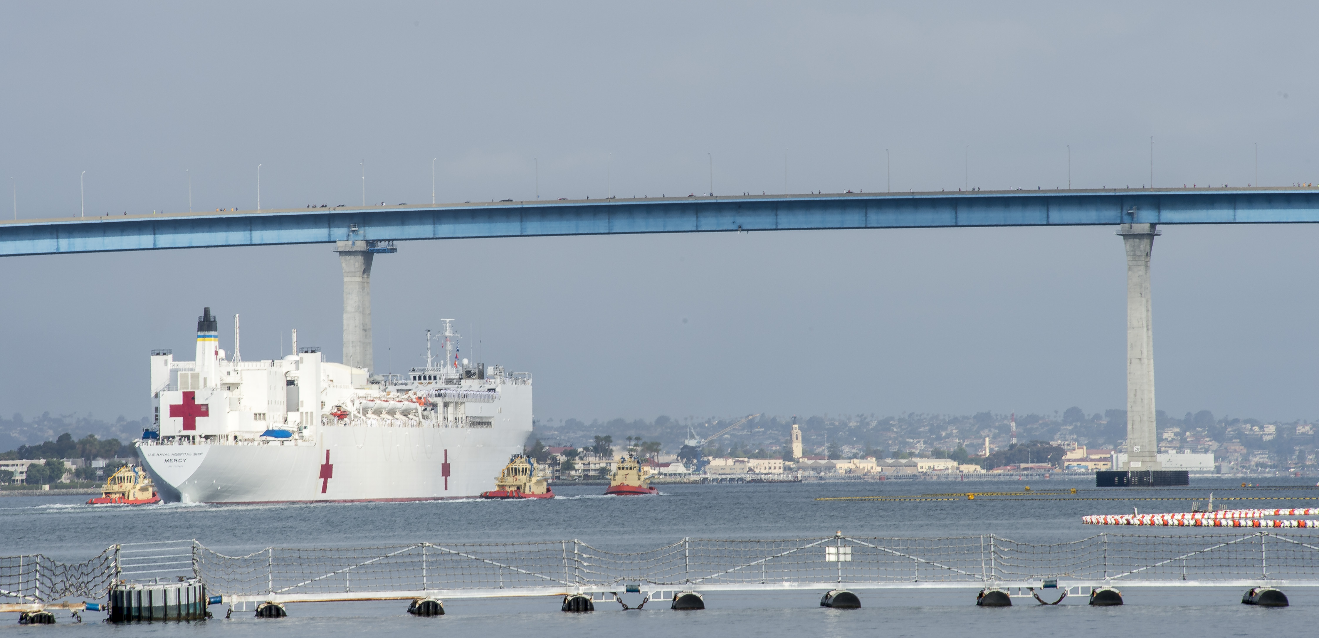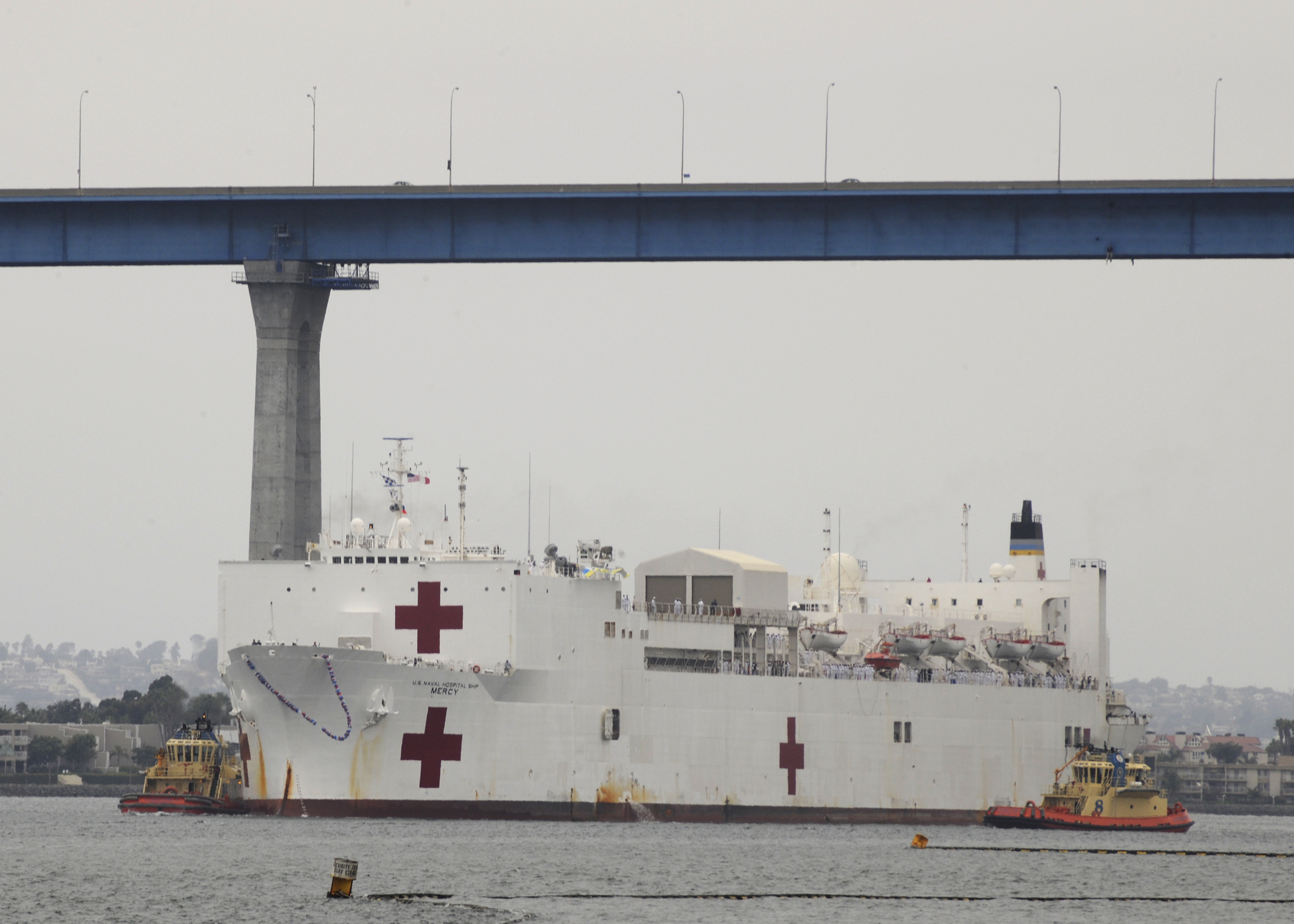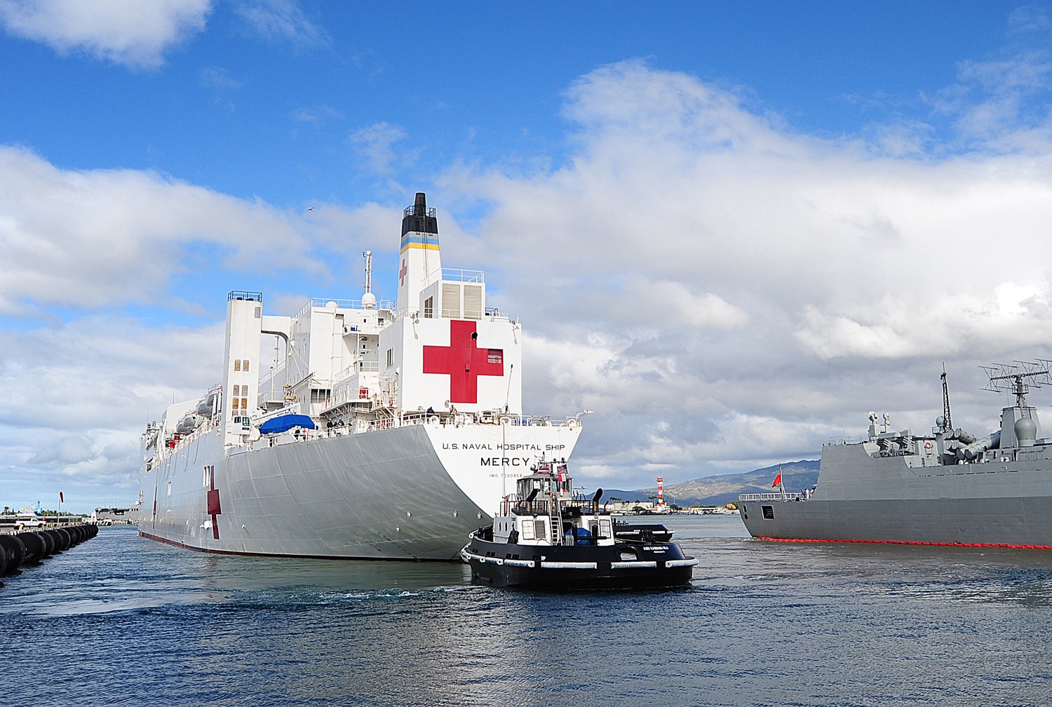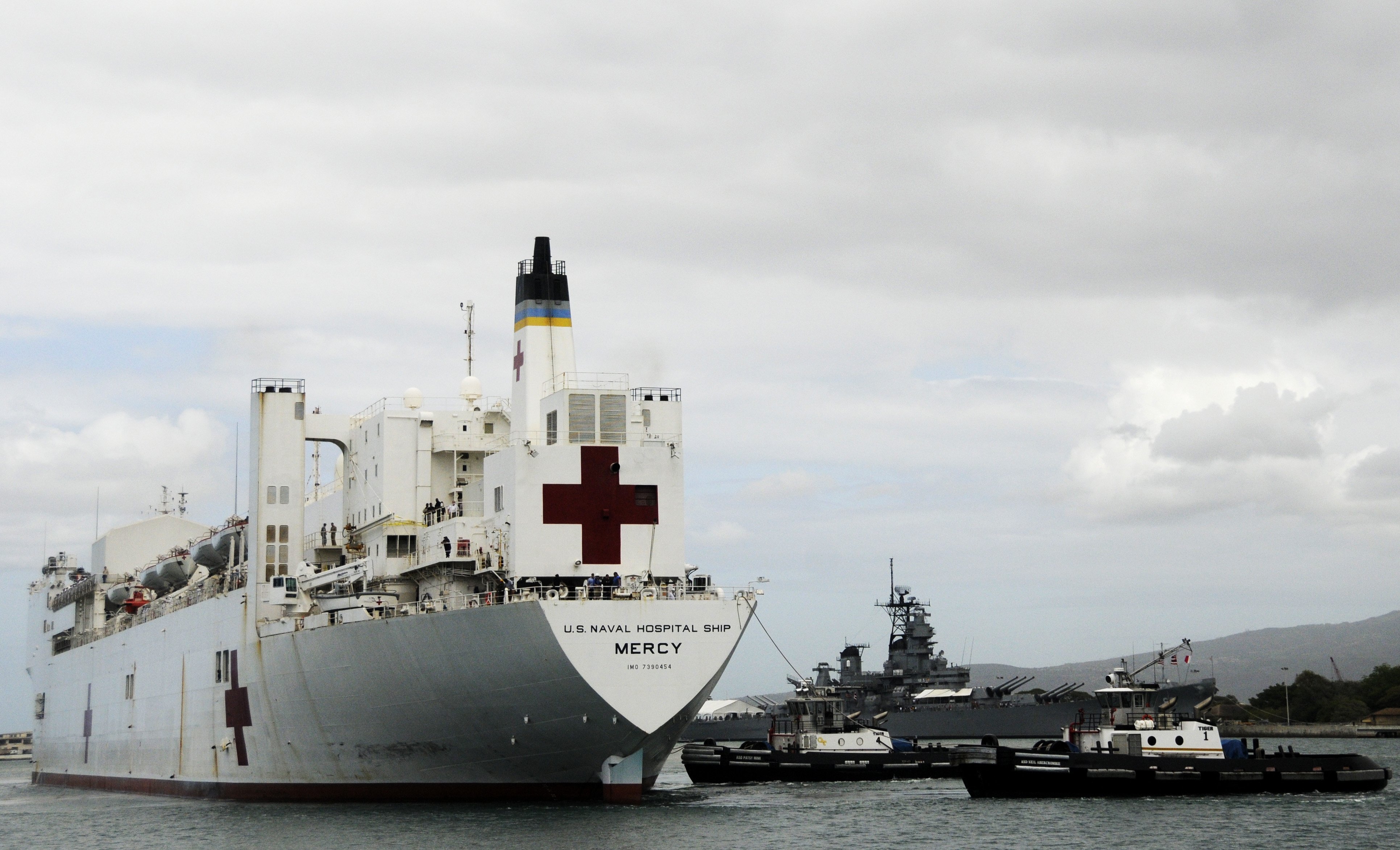 143k | USNS Mercy (T-AH-19), assisted by the Foss Maritime Co., tugboats Alta June, followed by Bo Brusco, and another