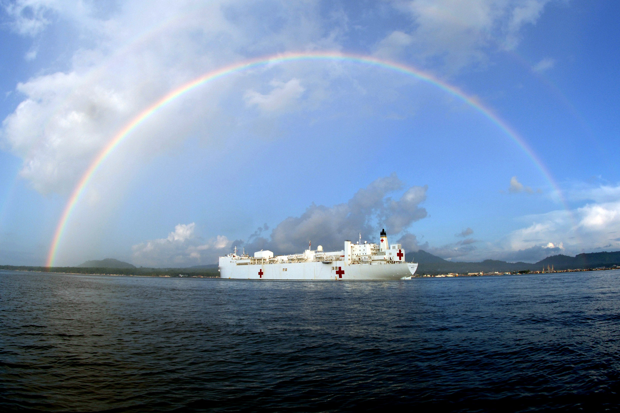 97k | USNS Mercy (T-AH-19) underway off the coast of Nias, Indonesia in the Indian Ocean, 4 April 2005. At the request of the government of Indonesia, Mercy and the USNS Niagara Falls (T-AFS-3) are on station off the coast of Nias, providing assistance as determined appropriate and necessary with earthquake disaster relief efforts and provide medical assistance to those in need. US Navy photo # 050404-N-6665R-174 by PH2 Jeffery Russell. |