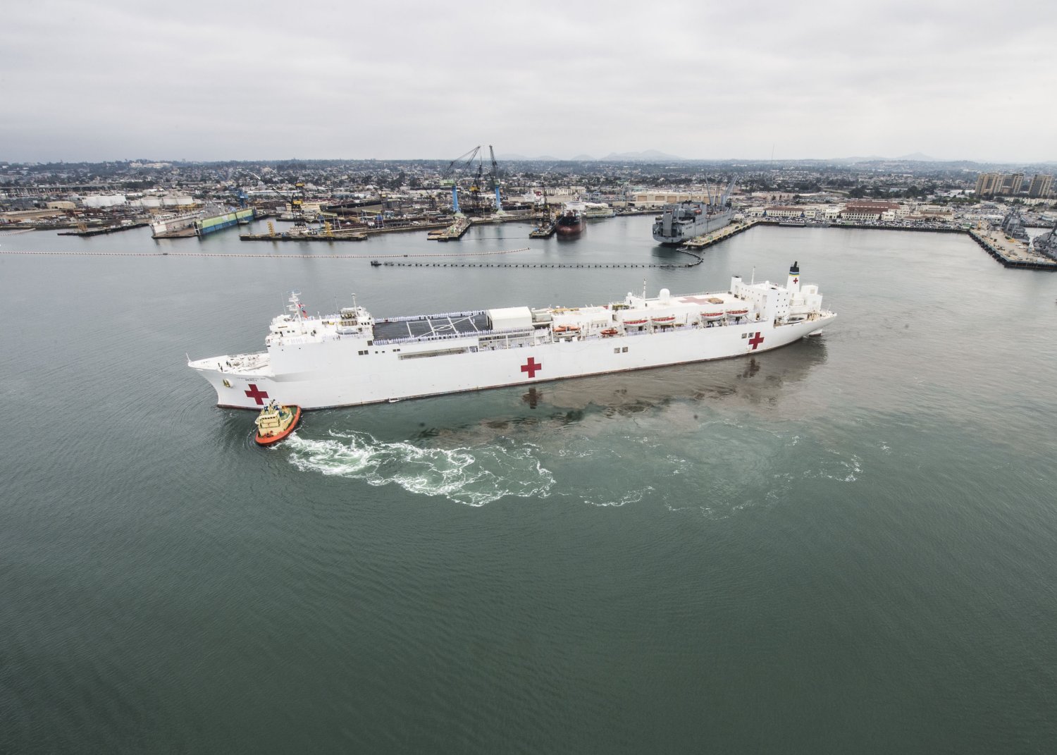 unidentified tug, departs Los Angeles, CA., 15 May 2020. Mercy deployed in support of the nation's COVID-19 response efforts, and served as a referral hospital for non-COVID-19 patients