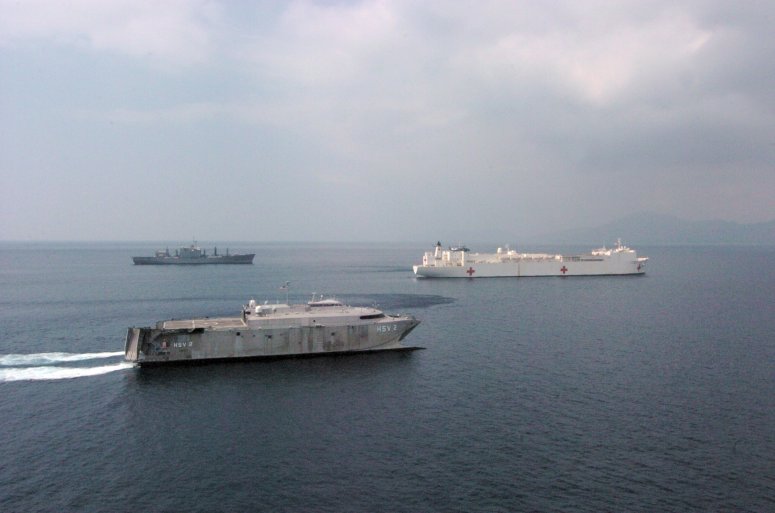 71k | USNS Mercy (T-AH-19) receives fuel from USNS Tippecanoe (T-AO 199) as combat stores ship USNS San Jose (T-AFS 7), far left, and the High Speed Vessel HSV Swift (HSV-2), far right, operate alongside in the Indian Ocean, 3 March 2005. Mercy is serving as an enabling platform to assist humanitarian operations ashore in ways that host nations and international relief organization find useful. Mercy is in the waters off the Indonesian coast in support of Operation Unified Assistance, the humanitarian relief effort to aid the victims of the tsunami that struck Southeast Asia. US Navy photo # 050303-N-8796S-075 by PH2 Timothy Smith |