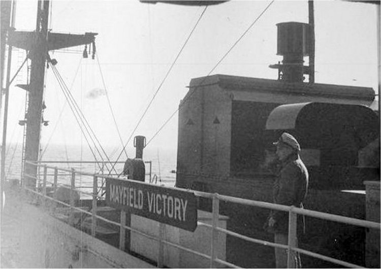 59k | Partial view of USS Mayfield Victory (AK-232)'s superstructure, date and location unknown. | Michael Rogers | |