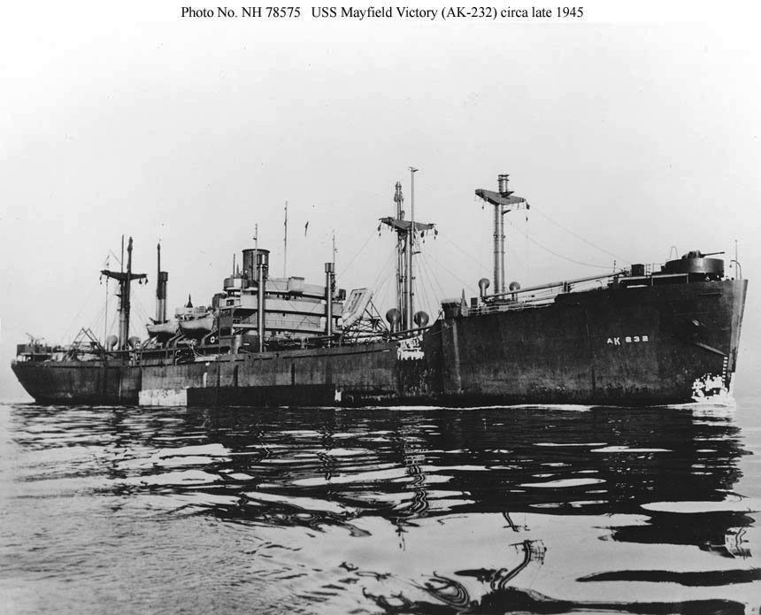 96k | Two versions of the same photo showing USS Mayfield Victory (AK-232), probably, when she returned to San Francisco from the Western Pacific in February 1946 after a stop at Seattle. Note in the first photo, which may have been used to sell the ship, LCT-755 and the forward gun tub have been removed from the photo.< br>US Naval History and Heritage Command, Photo # NH 78575, courtesy Shipscribe.com. | Mike Green Tommy Trampp |