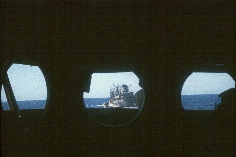 deck as she dropped back after taking on oil. Note retractable radio antennas mounted alongside the flight deck. Photo courtesy of Ted Huggins, 1970.
