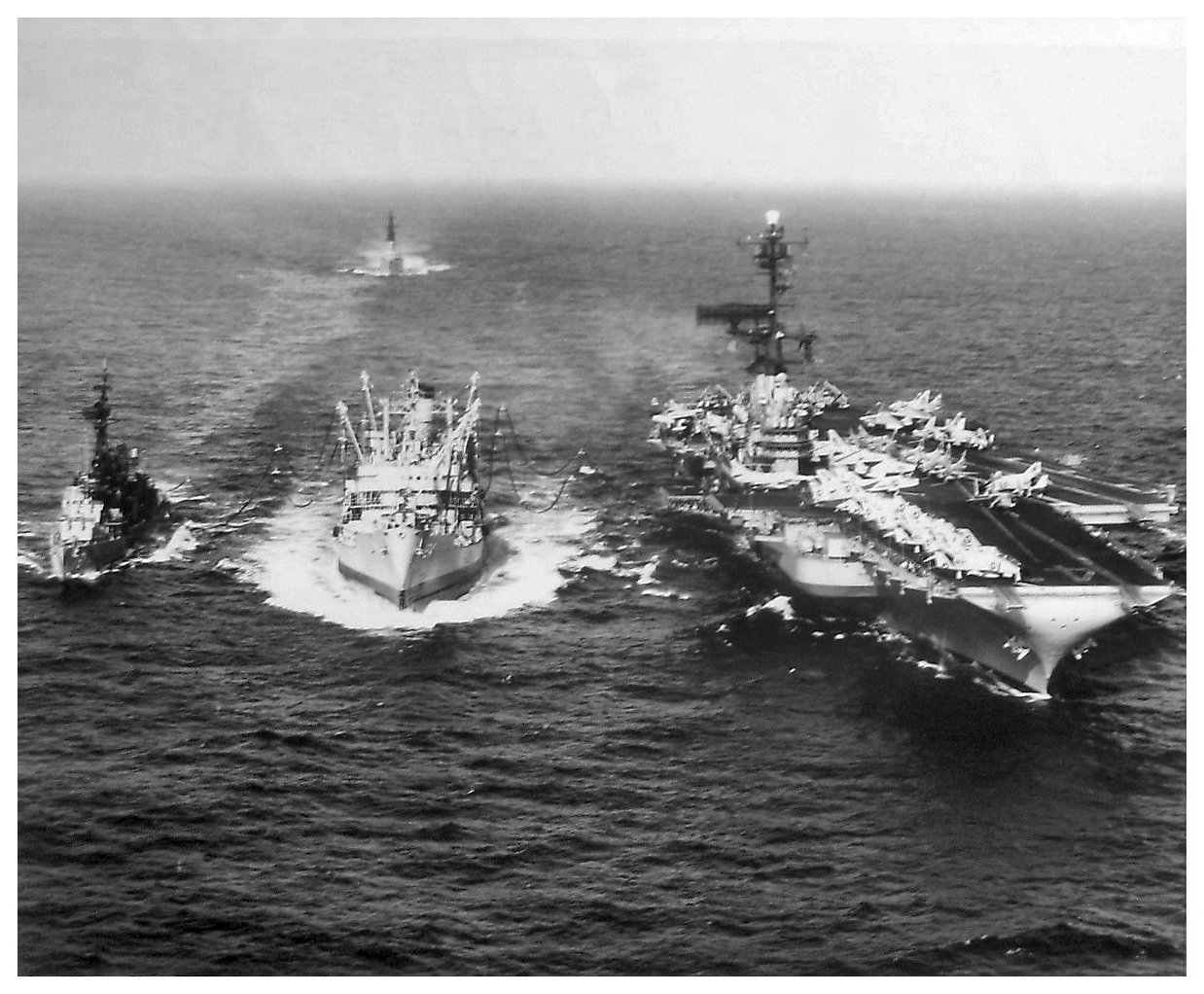 230k | USS Platte (AO-24) underway in the Tonkin Gulf off the coast of Vietnam while refueling USS Buck (DD-761) (at left) and USS Franklin D. Roosevelt (CVA-42) (at right) in 1968. Note the second destroyer trailing the formation in plane guard position. | Richard Miller BMCS USNR Ret. and Mike Smolinski |