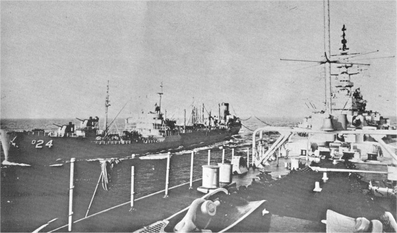 167k | USS Sigsbee (DD-502) pulling away from USS Platte (AO-24), 23 February 1945, during the Iwo Jima support by TG58.1.