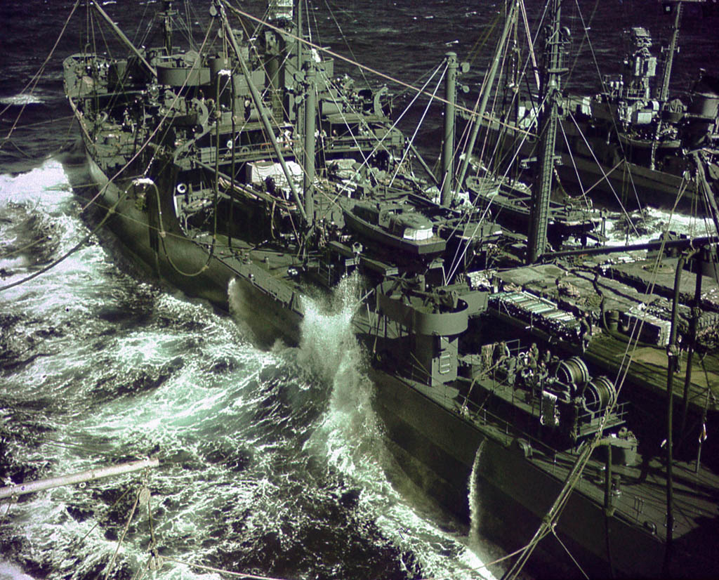 280k | USS Platte (AO-24) underway during a replenishment at sea, on the cold morning of 23 February 1945 re-fueling TF58.1.