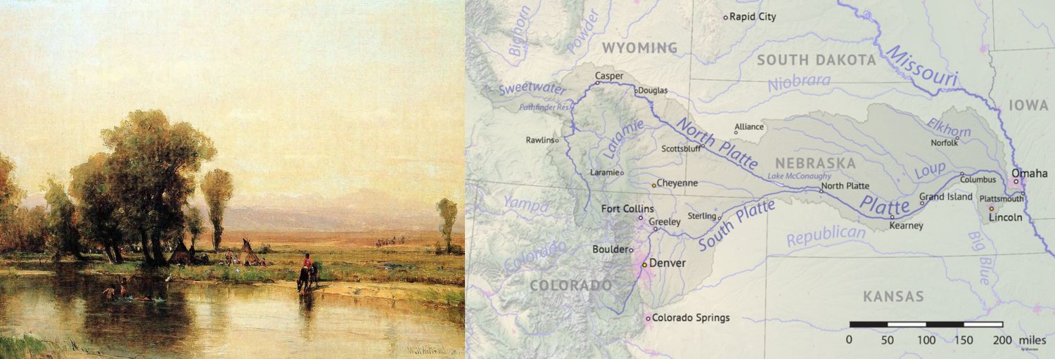 160k | "Encampment along the Platte", painting by Worthington Whittredge (1820-1910) Platte River watershed with tributaries, by Shannon 1, based on USGS National Map and NASA SRTM data. |
