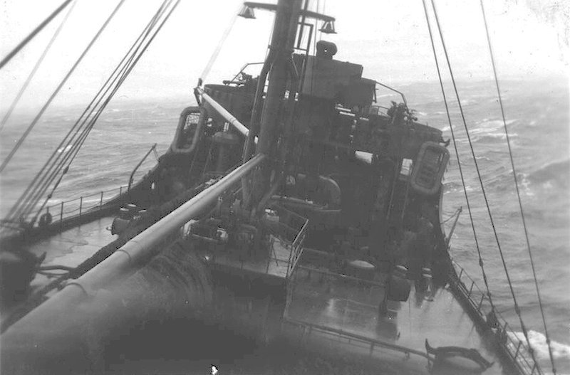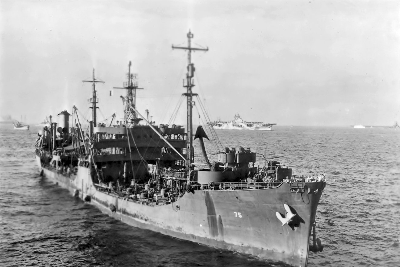 63k | USS Saugatuck (AO-75) underway in typhoon weather off Okinawa, post-war, Fall 1945. | John Chiquoine and Carmen Costa, courtesy Al DeSantis collection | |