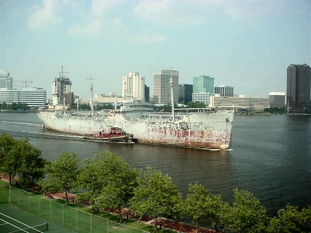 66k | Ex-USS Saugatuck (AO-75) being moved from the James River Reserve Fleet through Hampton Roads while enroute to Bay Bridge Enterprise of Chesapeake, VA. for scrapping, 18 July 2006.Note the Norfolk, VA. skyline in th background of photo 091907506. | Photo 091907506 by Mabel Clark Photo 091907525 contributed by Nicholas Tiberio |