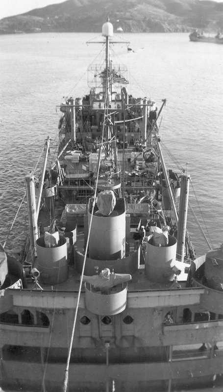79k | View of USS Saugatuck (AO-75) looking forward from the afterdeck to the superstructure, circa late-1945 early-1946, probably in San Francisco Bay. | John Chiquoine and Carmen Costa, courtesy Al DeSantis collection | |