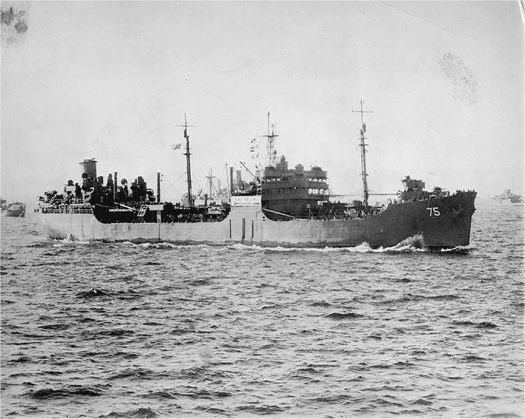 48k | USS Saugatuck (AO-75) (stern view) in San Francisco Bay, 21 June 1943. Navy Yard Mare Island photo #4587-43, 6/21/43. |