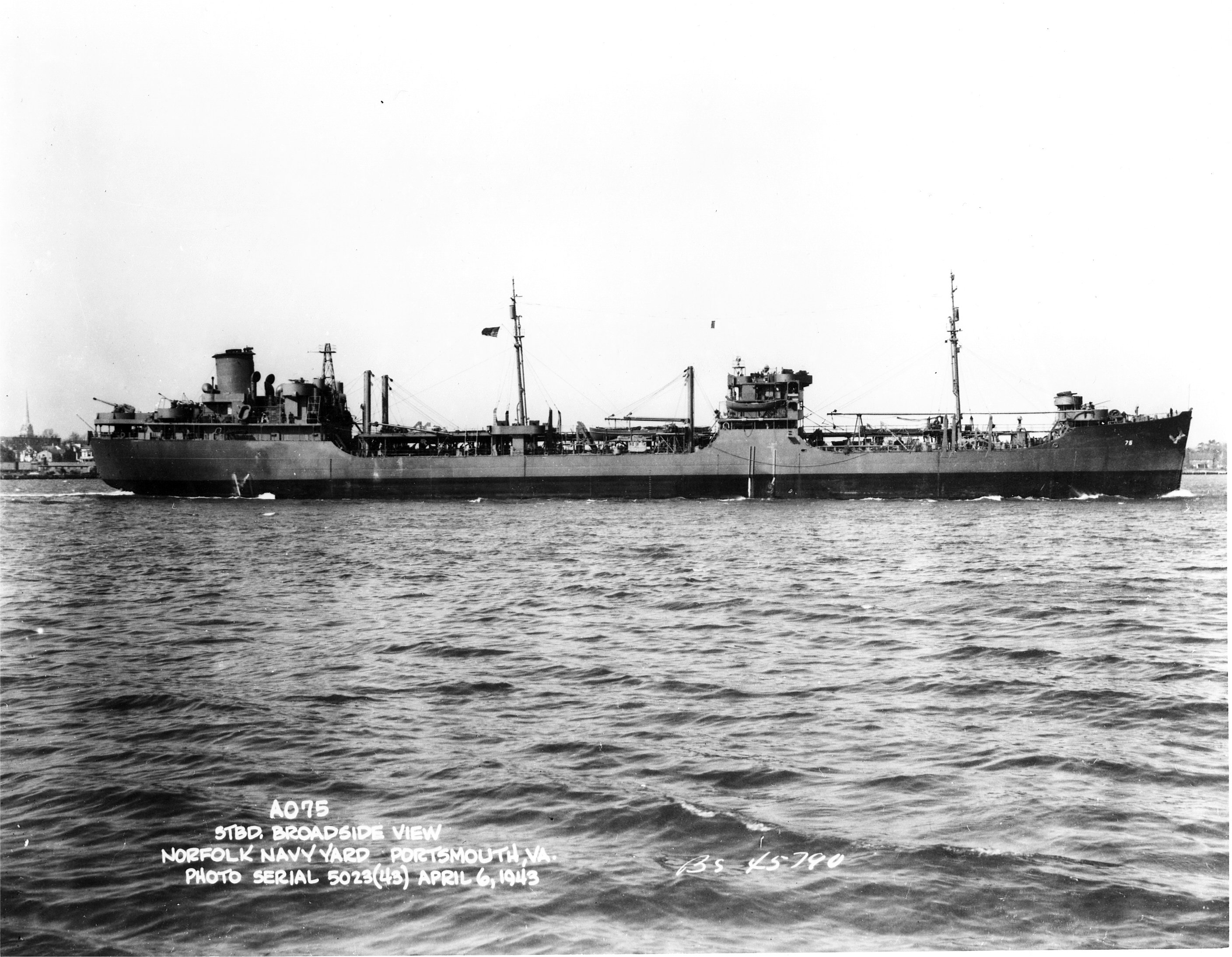 931k | Starboard broadside view of USS Saugatuck (AO-75) underway in Hampton Roads off Portsmouth, VA., prior to departing for the Pacific Theater, 6 April 1943. US Navy Yard Norfolk, photo #5023(43) April 6, 1943 / BUSHIPS photo #45790. |