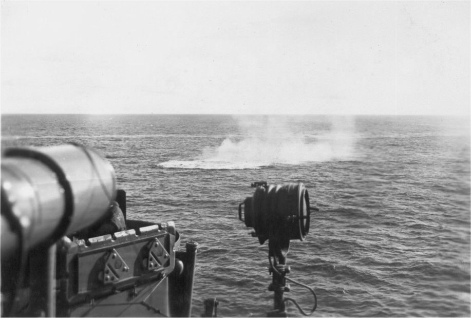 78k | As seen from USS Saugatuck (AO-75), this view is reported as a fading bomb-splash. This near-miss came on a 18 June 1944 horizontal bomber attack off Saipan. USS Saranac (AO-74) and USS Neshanic (AO-71) had just been damaged in the same attack | John Chiquoine and Carmen Costa, courtesy Al DeSantis collection | |
