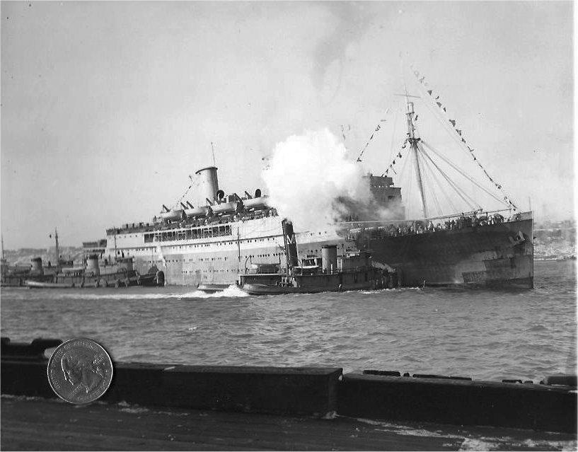 and acquired by the Navy and the hull designation AP-45 was reserved for her. US Naval History and Heritage Command. Photo # NH 85266, courtesy Shipscribe.com. |