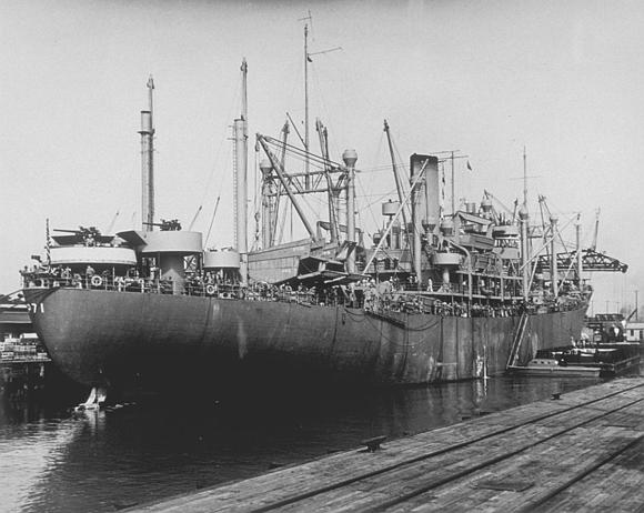 42k | USS Lyon (AP-71) moored at US Army Port of Embarkation, Newport News, VA. pier loading troops. Official US Army photo produced by US Army Signal Corps, Hampton Roads Port of Embarkation, 20 October 1942. Photo now in the collections of the Library of Virginia. Image No. C1:2/01/025 |